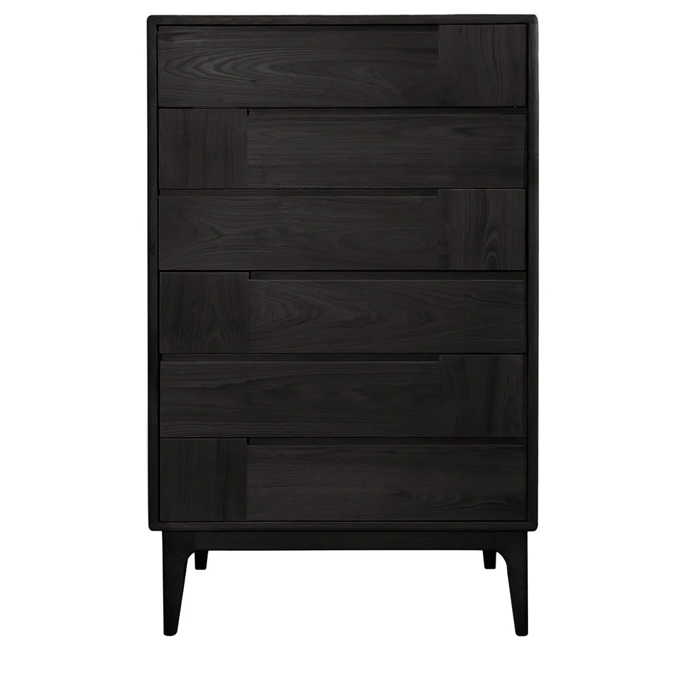 Un look total black dal fascino sofisticato, questo comò in stile scandinavo sarà un’aggiunta maestosa a un interno contemporaneo. Realizzato a mano in castagno massiccio colorato, presenta sei cassetti dalle linee orizzontali e verticali che creano una pratica scanalatura che funge da maniglia. Internamente è realizzato in faggio massiccio e poggia su piedi corti e sottili. Lucidato con lacche all’acqua e rifinito con cera d’api. Personalizzabile su richiesta, contattare il Concierge per i dettagli.