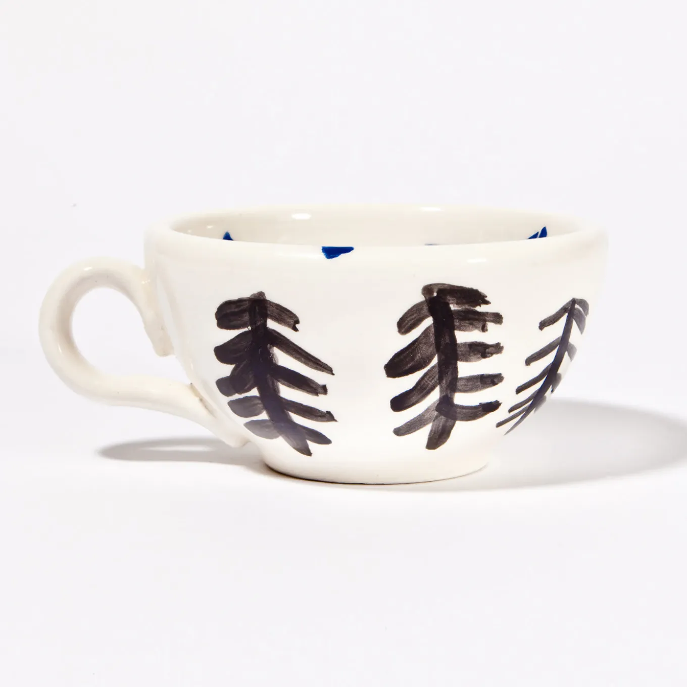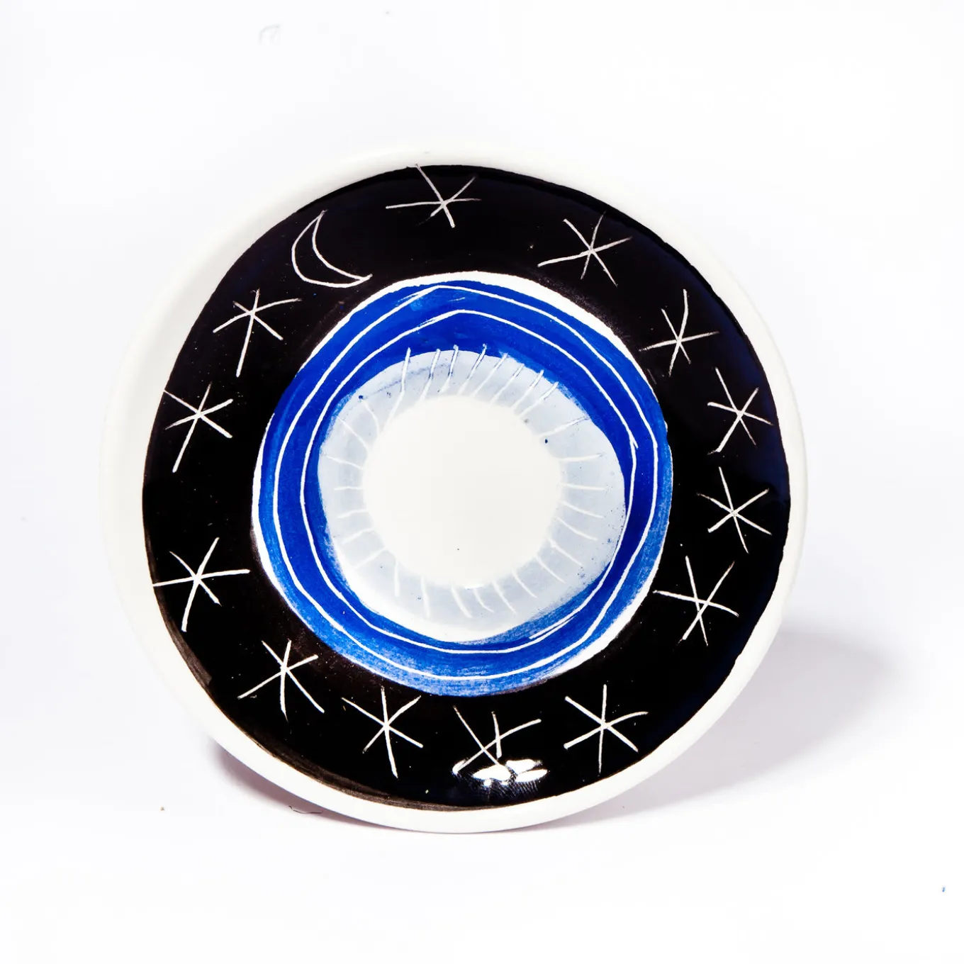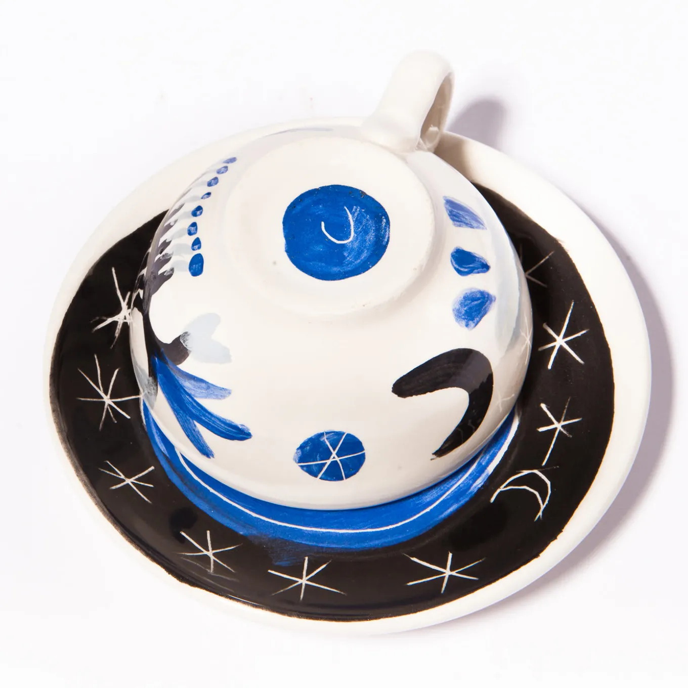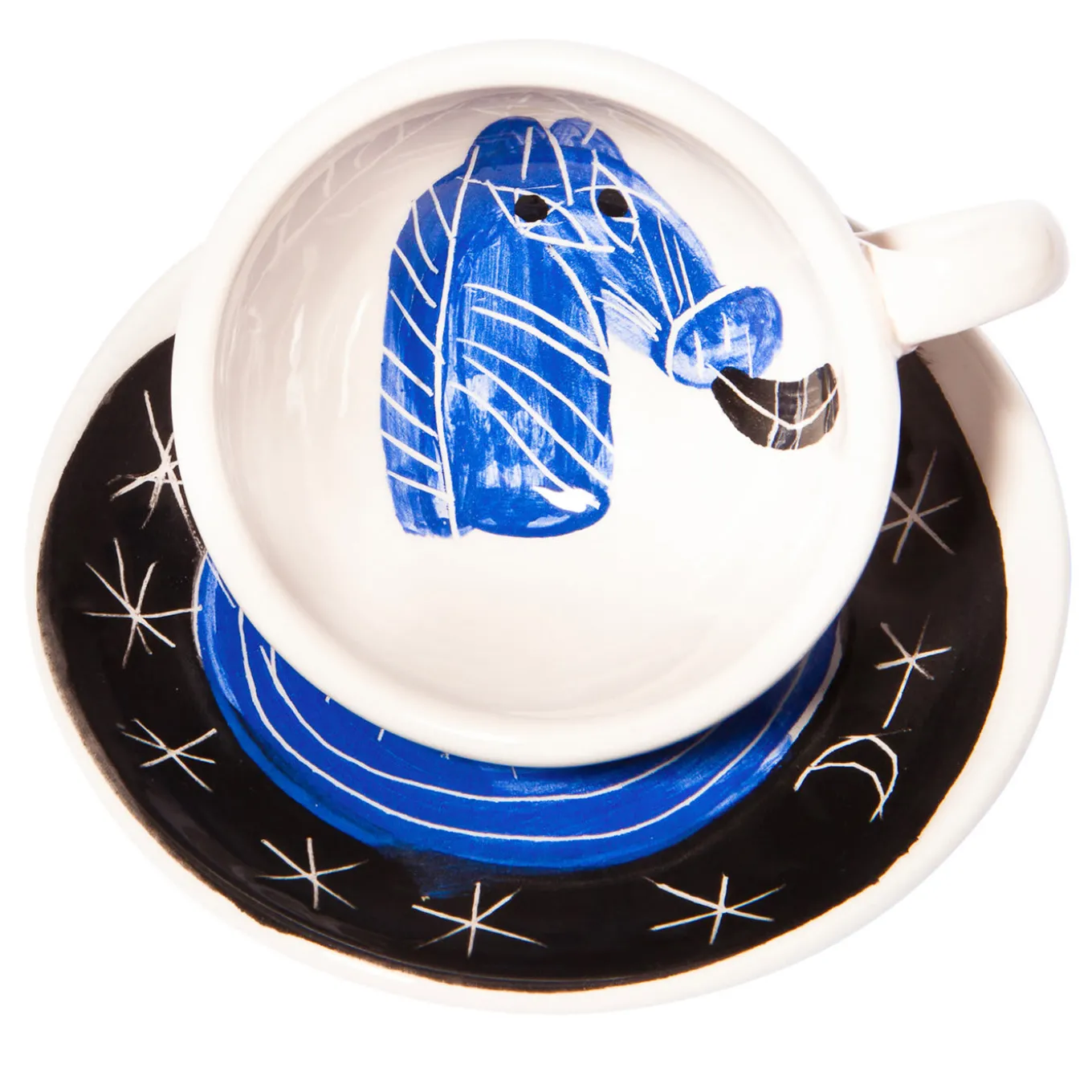 Parte di una serie ispirata alle collezioni medievali di creature reali e fantastiche e alle pitture sui soffitti delle piramidi egizie, questo set di tazzina e piattino da caffè espresso è stato interamente dipinto a mano su una superficie di argilla con finitura smaltata. Sul fondo bianco della tazzina (Ø 8 cm, H 4,5 cm), l’artista ha utilizzato i colori tipici della tecnica tradizionale dell’engobbio (grigio chiaro, blu e nero) per creare il ritratto giocosamente eclettico di un cavallo che fa uscire la lingua dalla bocca. Il piattino (Ø 12 cm) è ornato da un’eclettica rappresentazione di un cielo stellato.