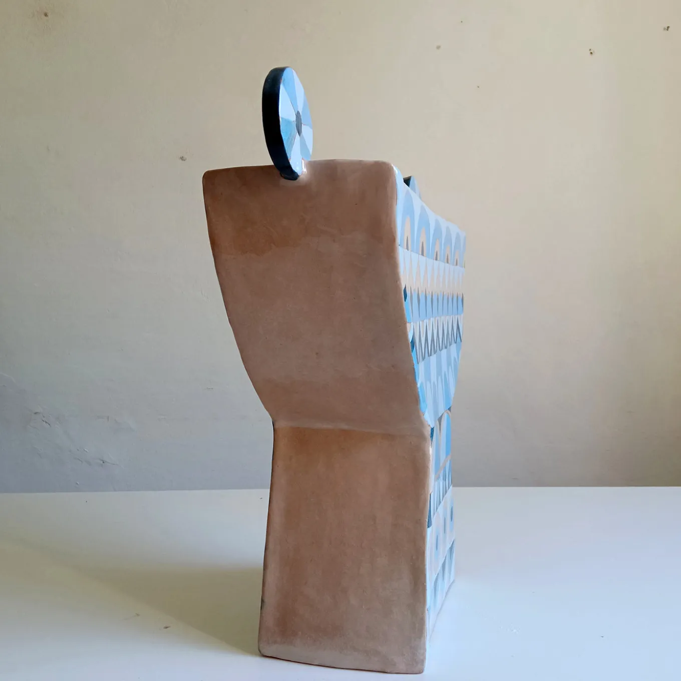 Questa alzata in terracotta presenta un design decorato a mano ispirato ai tradizionali motivi mediterranei. Mostra un’armonica combinazione di motivi geometrici in diverse sfumature di blu e toni terra, offrendo un’aggiunta accattivante a qualsiasi ambiente. La sua dimensione sostanziale e forma unica creano un impatto visivo audace, rendendola adatta sia a contenere frutta o oggetti decorativi che a migliorare l’atmosfera degli spazi interni. Ogni creazione è unica e può differire leggermente per via della lavorazione artigianale.
