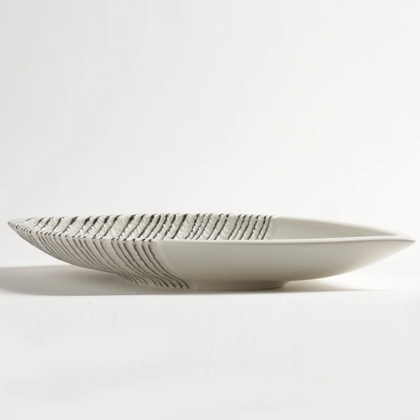 Questo squisito centrotavola in porcellana combina un design sinuoso con la preziosità degli accenti di platino applicati a mano che ne evidenziano la consistenza unica, rendendolo un sorprendente oggetto d’arte.
