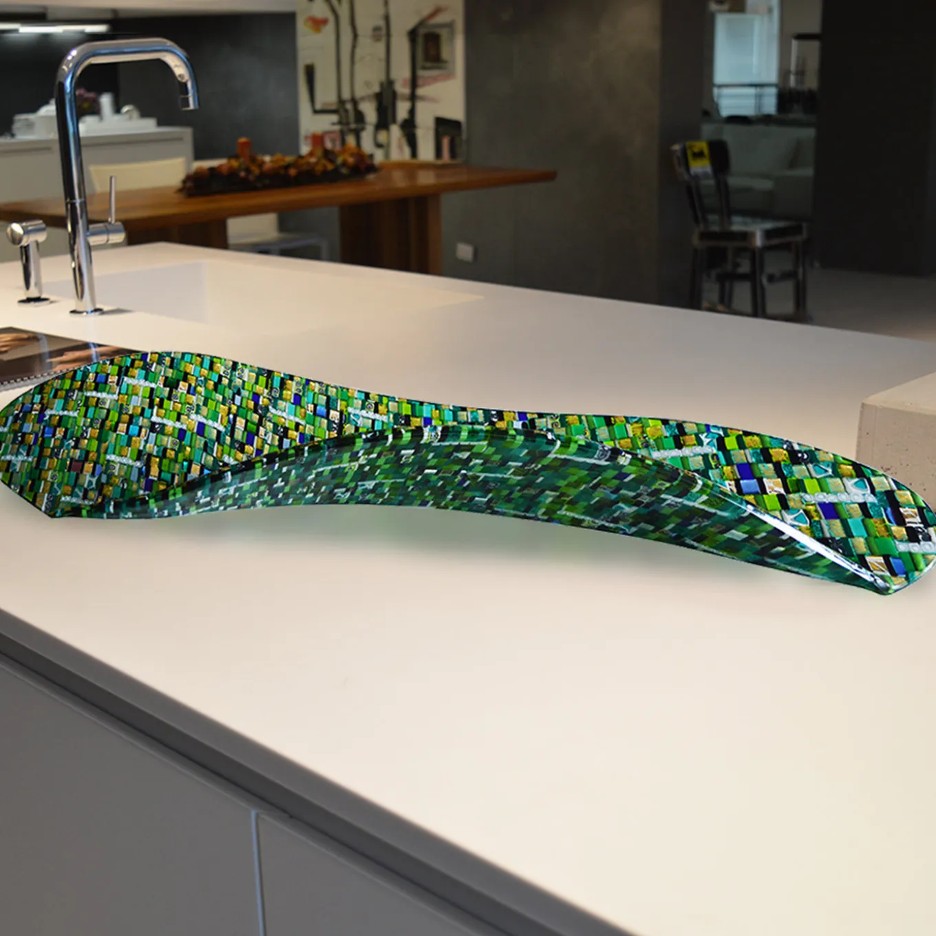Questo centrotavola presenta una forma sinuosa distintiva ispirata allo stile del mosaico veneziano, con un ricco motivo di mosaico verde arricchito da accenti in foglia d’oro e d’argento e da speciali murrine. Il design è impreziosito da piccoli inserti in tonalità di blu chiaro, acquamarina, nero e murrine veneziane, creando un pezzo decorativo dinamico e originale. Ogni elemento è accuratamente composto con variazioni di dimensioni a causa del suo processo di creazione artigianale.