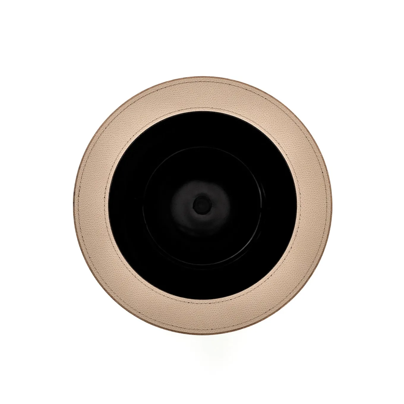 Elegante e innovativo, questo cestino per la carta è interamente rivestito in pelle Malaga, in un versatile color tortora. Realizzato in plastica nera per un uso facile e pratico, è dotato di un coperchio aperto rimovibile che gli conferisce una qualità compatta.