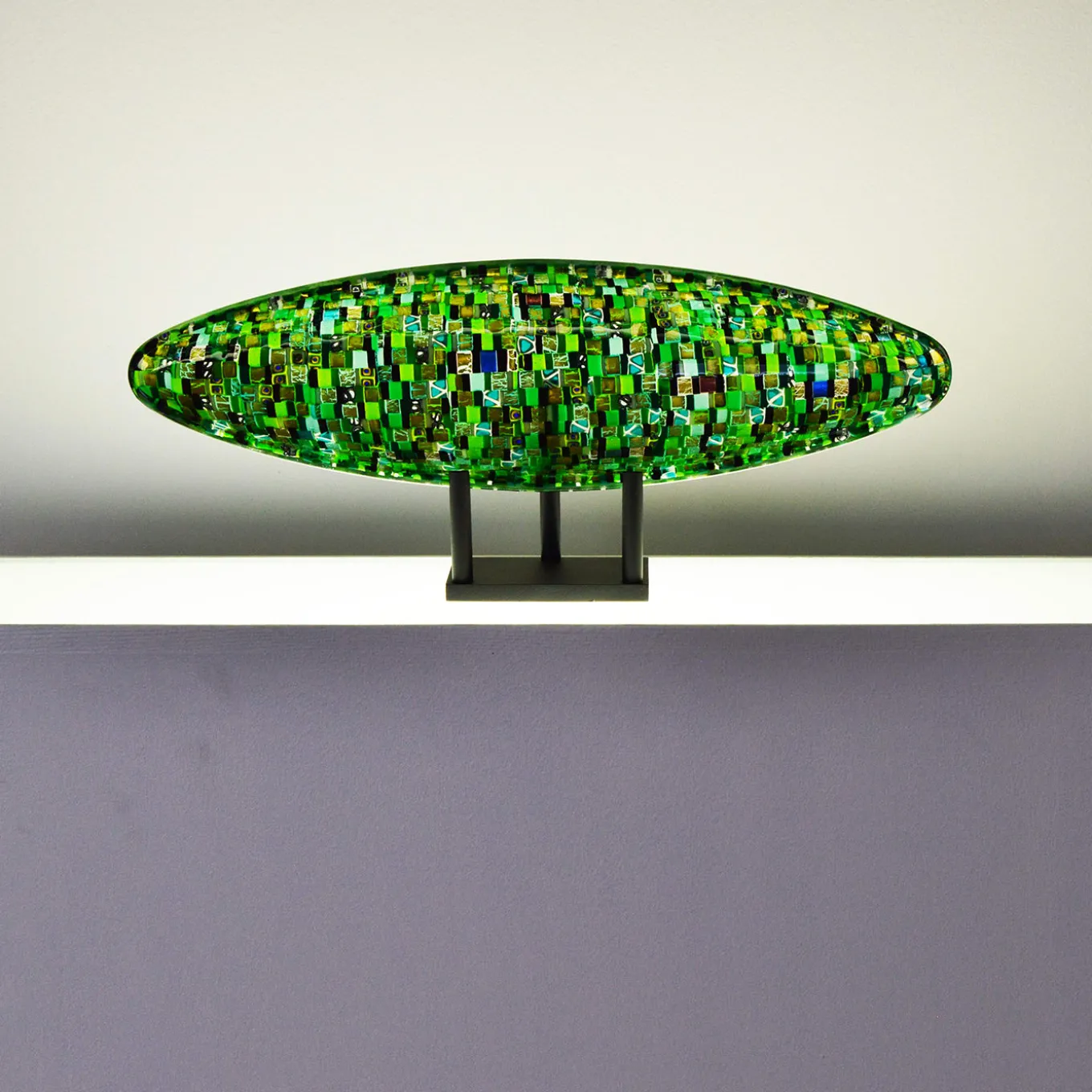 Un design eloquente che celebra Venezia, questa ciotola centrotavola a forma di gondola catturerà sicuramente lo sguardo con le sue tessere di vetro colorate a contrasto. Un accurato processo di assemblaggio manuale è alla base del suo design a mosaico, tanto ipnotizzante nel disegno quanto nei colori, dove prevalgono inequivocabilmente le vibranti tonalità del verde. Preziosi inserti in foglia d’oro suggellano il lusso del pezzo.