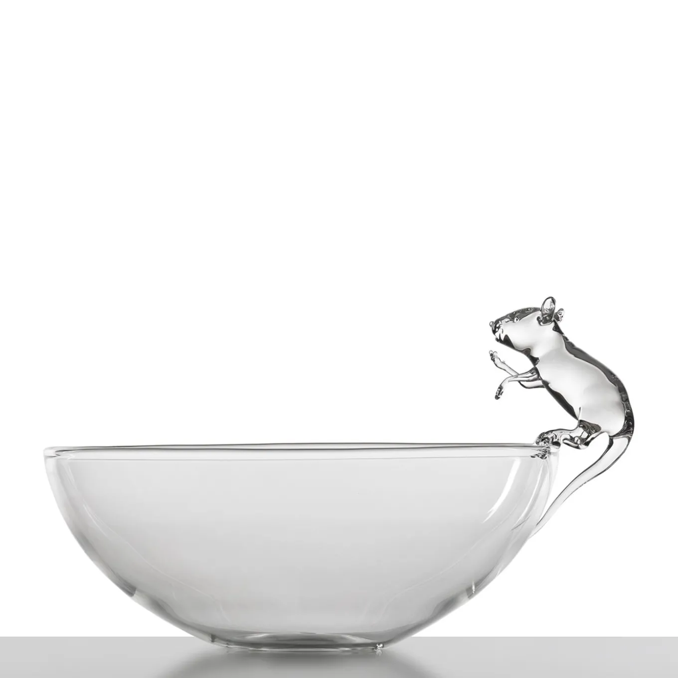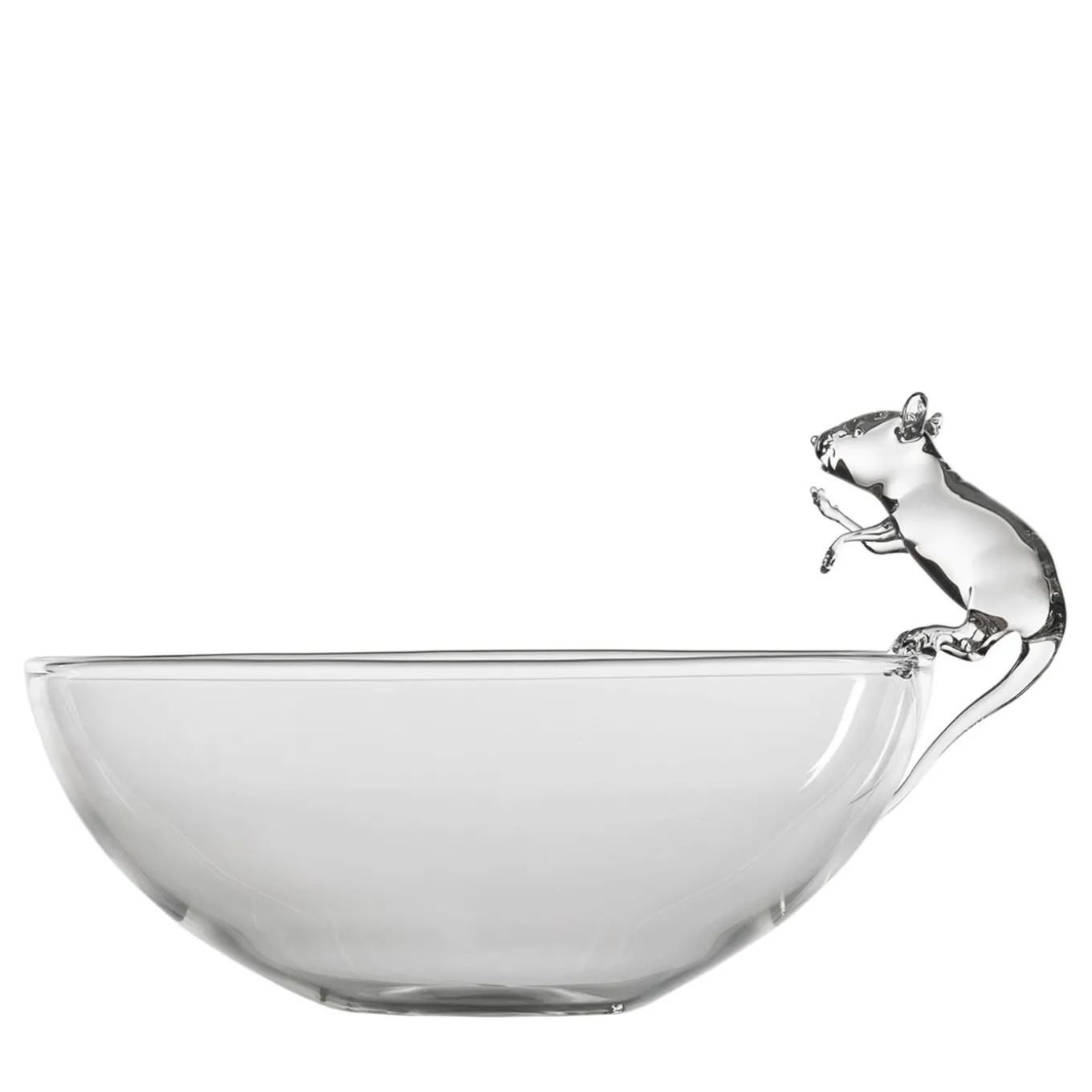 Ciotola in vetro soffiato a mano di Simone Crestani. Artigiano, intelligente, sempre indaffarato; rapido e scattante, attento e giudizioso. Tanto piccolo quanto agile, un topolino di vetro intento a rubare un boccone di cibo, zampetta felice come se nulla fosse, unendosi al banchetto della vostra tavola in una ciotola realizzata interamente a mano.