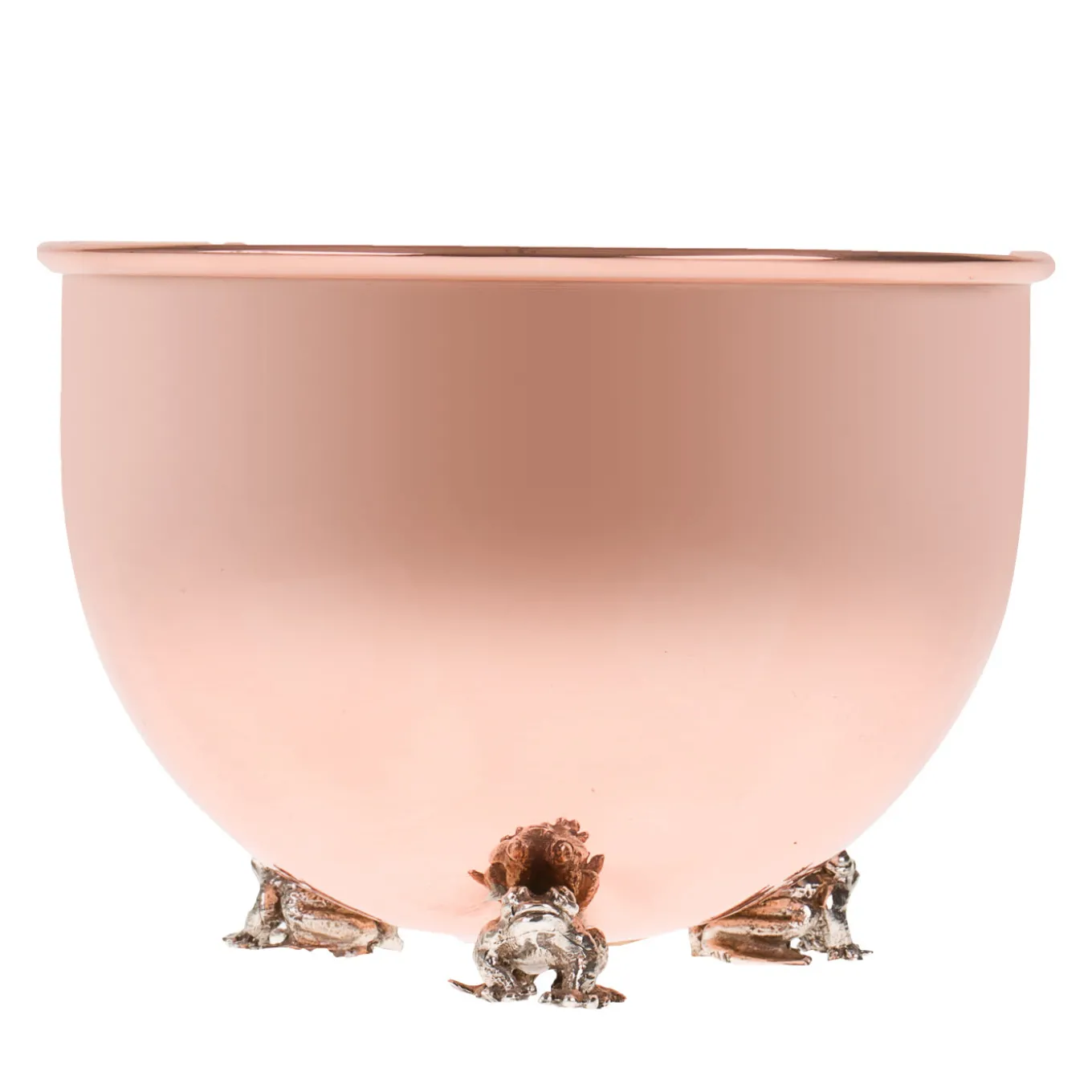 Delicata ciotola a forma di cupola realizzata in rame scintillante e sostenuta da tre alamari in argento massiccio, eseguiti con la tradizionale fusione a cera persa e saldati al pezzo dagli abili argentieri del laboratorio fiorentino Pagliai.