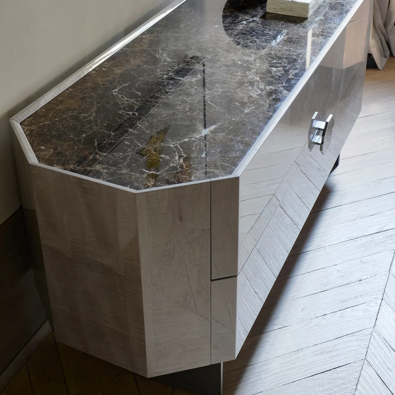 Cassettone ok 2 cassetti con piano in legno, finiture in metallo e piedini laccati, apertura con maniglia – finitura lucida Lupo, maniglia in marmo Emperador Dark, metallo Nickel