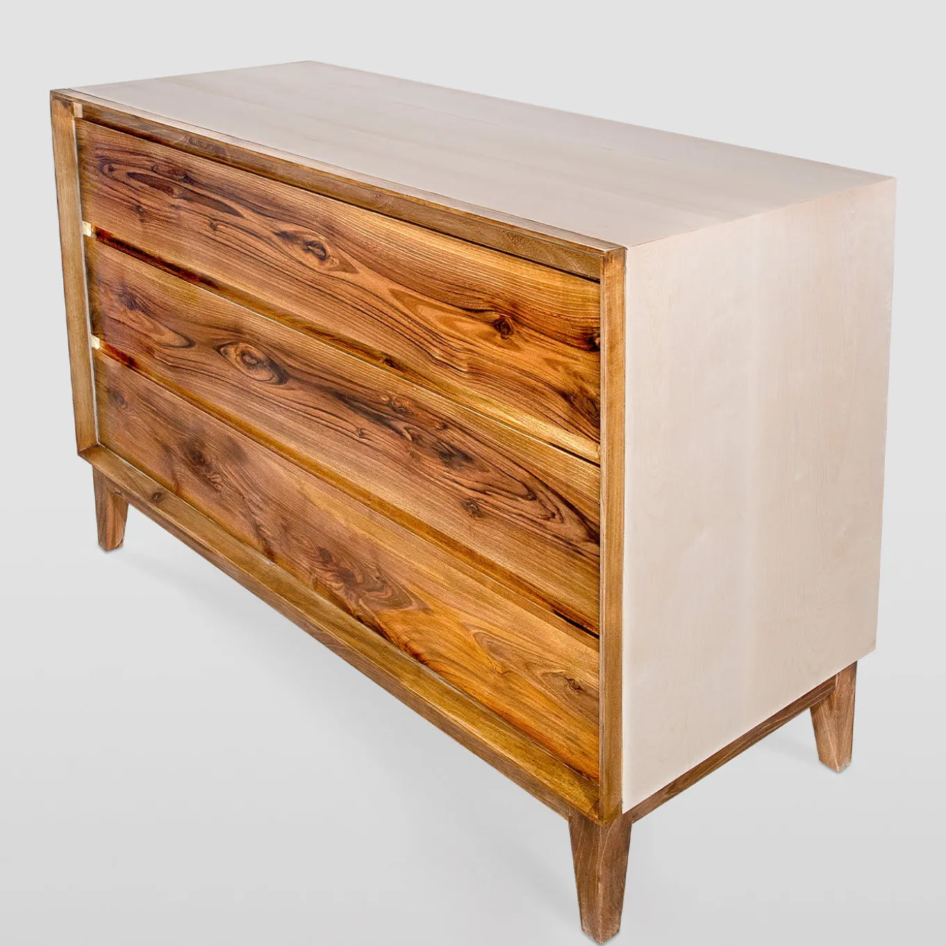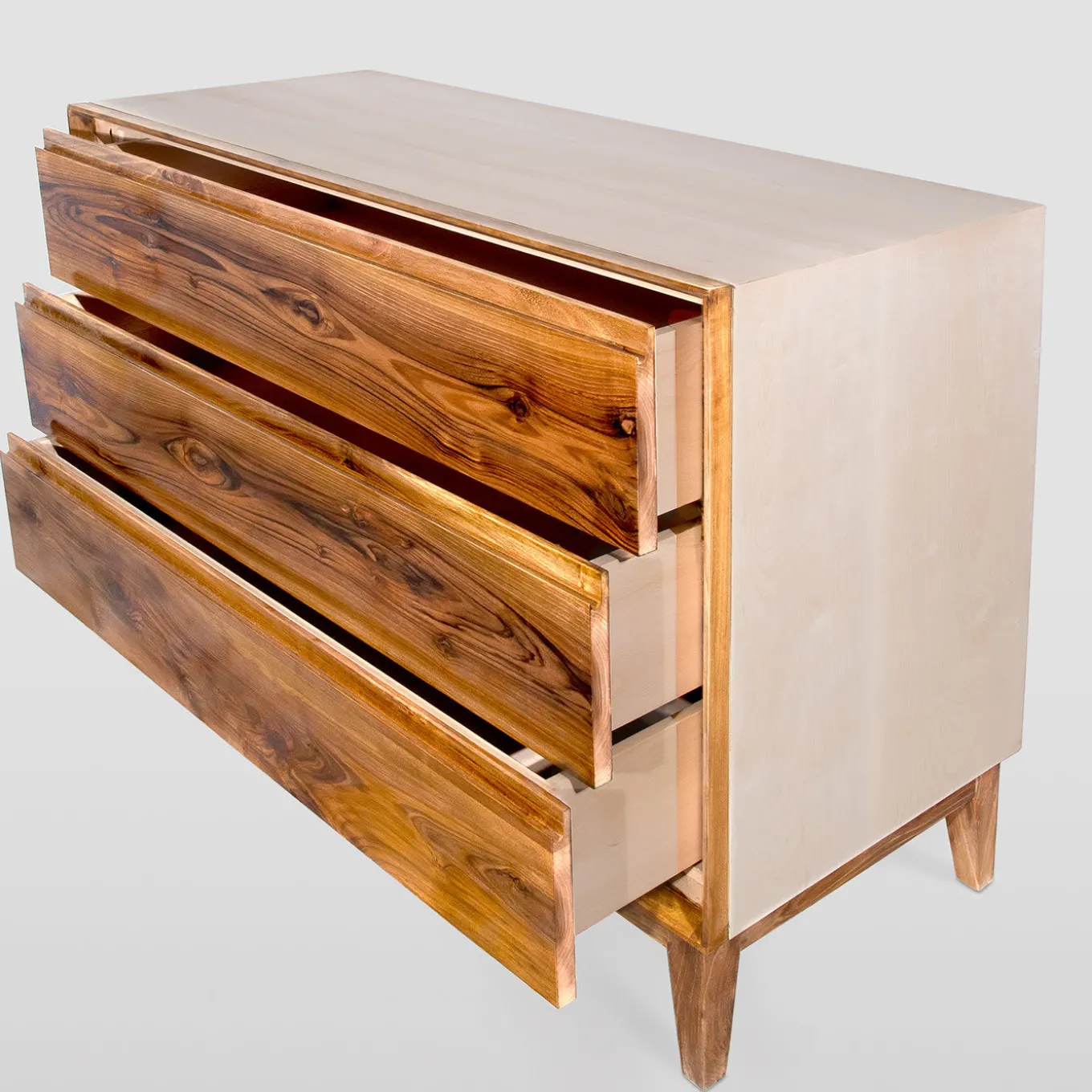 Sublime omaggio alla magnificenza del legno, questo comò a tre cassetti è interamente realizzato e rifinito da mani esperte e sapienti. Realizzato in legno massiccio, è composto da noce per la base e da essenza di acero per il corpo principale. Rifinito a mano con una laccatura lucida, i cassetti sono dotati di guide di scorrimento metalliche nascoste (marchio BLUM). Il pezzo è brillantemente verniciato con una lacca a base d’acqua e infine rifinito con cera d’api per un’allure assolutamente raffinata. Personalizzabile su richiesta.