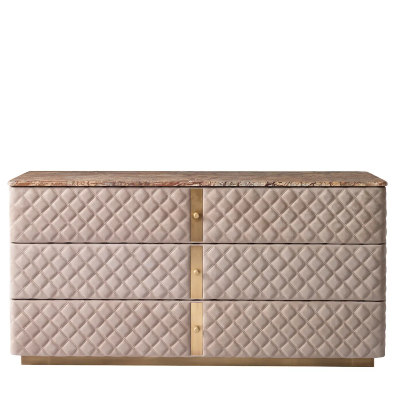 Questo splendido comò doppio a 3 cassetti Alfred offre uno stile lussuoso per completare il vostro arredamento contemporaneo o classico. La struttura in multistrato è caratterizzata da trapuntature e inserti a forma di diamante con finitura in ottone brunito e bottoni logati. I cassetti foderati su morbide guide metalliche e la base e le maniglie in ottone con finitura in ottone brunito si combinano magnificamente con il piano in marmo Rain Forest.