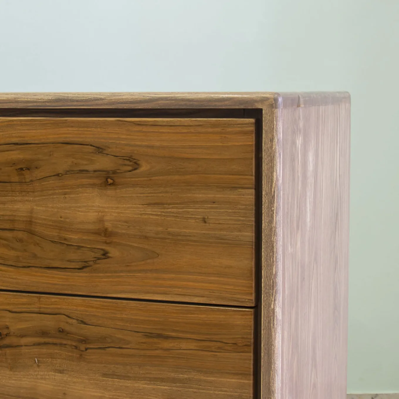Le linee sobrie e pulite del comò Liv rivelano una costruzione impeccabile, progettata da Erika Gambella e realizzata da esperti artigiani con tecniche ebanistiche tradizionali. La robusta struttura in frassino con lucidatura a cera d’api opaca e satinata, poggia su una base incassata con piedini di livellamento e ospita tre ampi cassetti in faggio con frontali in noce gommato lucido, dotati di guide di scorrimento in metallo Blum e sistema di apertura Touch. Data l’elevata capacità di carico e la larghezza dei cassetti, le barre di stabilizzazione sono nascoste nella struttura.