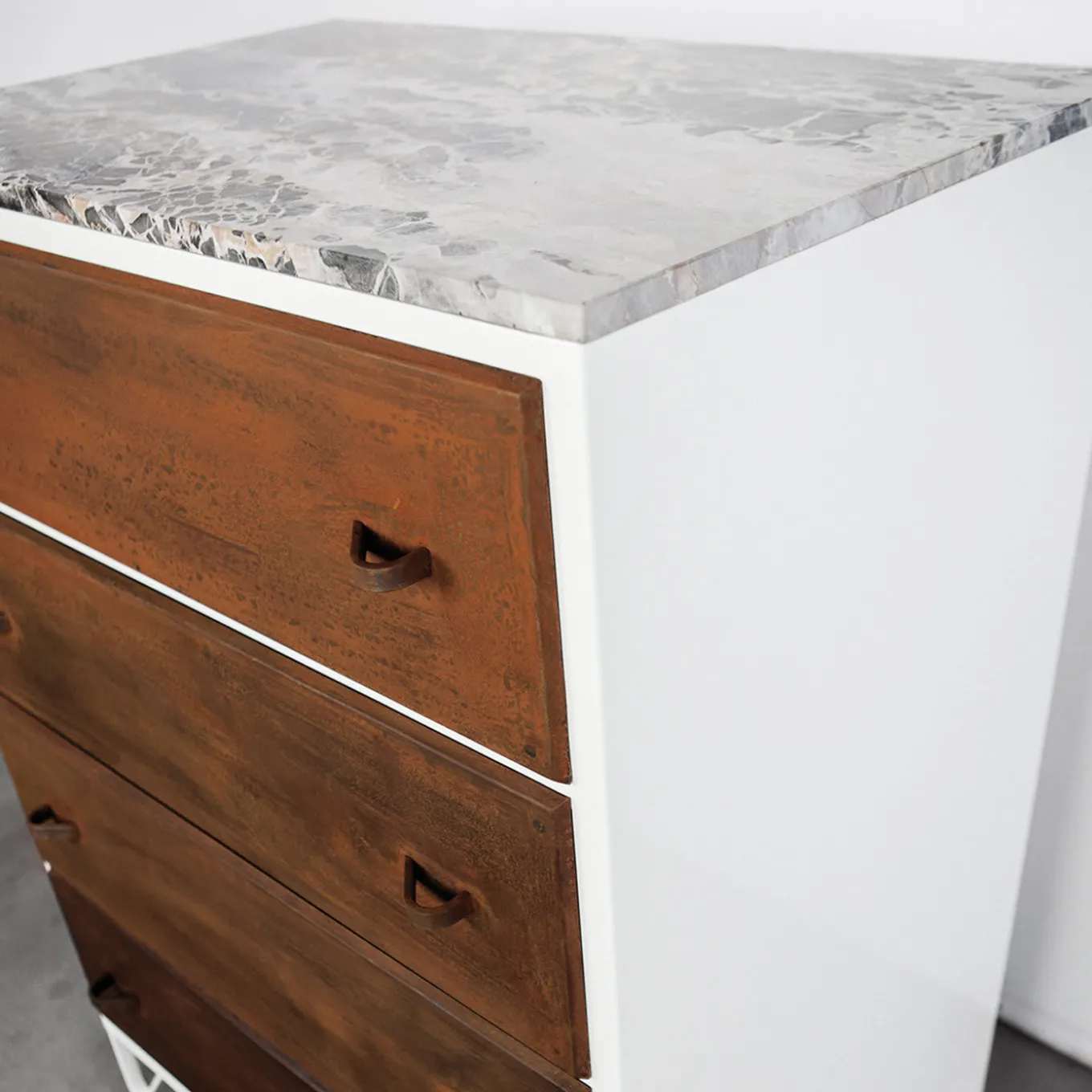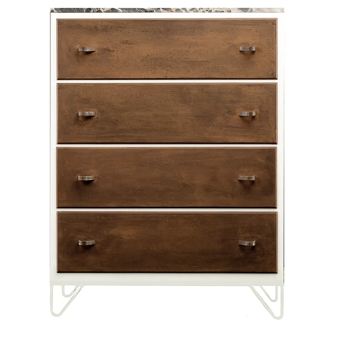 Questo pezzo è una reinterpretazione contemporanea del comò della nonna. Il piano in marmo e il sapore retrò creano un’allure elegante e antica. La finitura in acciaio o la struttura contrastano con la superficie del marmo e la consistenza del legno. Questa combinazione è gradevole alla vista e si farà notare in qualsiasi stanza venga collocata. La personalità unica di questo comò arreda con eleganza uno spazio dando un senso di modernità.