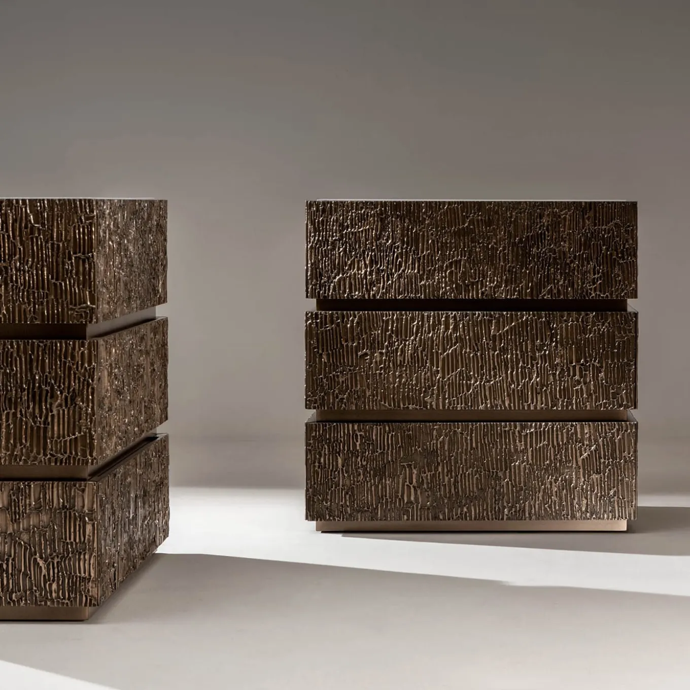 Cassettiera con motivo Corteccia in metallo liquido bronzo su fronte e fianchi, piano in marmo bianco di Carrara. Dotato di 3 cassetti.