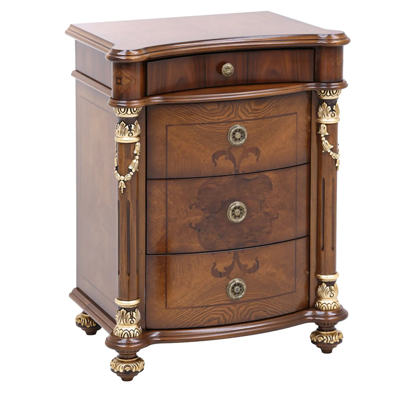 Questo eccezionale comodino è il naturale abbinamento alla struttura del letto Nabucco. Caratterizzato da curve morbide e da squisiti intagli decorati con luminose applicazioni in foglia d’oro, la sua ornata silhouette in legno vanta raffinati intarsi in frassino piumato, radica di noce e palissandro che esaltano le venature naturali del legno. Questo design, decisamente classico, esemplifica in modo superbo il più raffinato stile barocco.