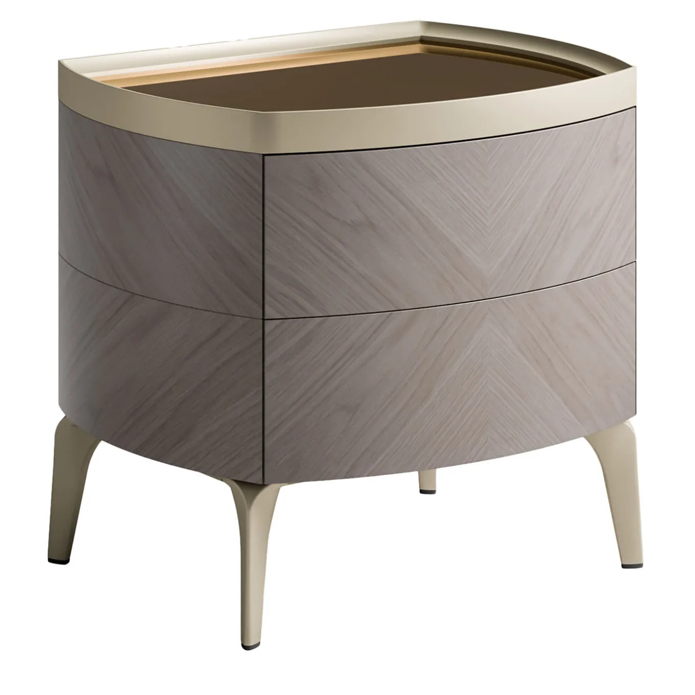Comodino con 2 cassetti in finitura rovere, piedini in metallo essenza e piano in specchio bronzo. Disponibile piano in lamina e diversi colori laccati (per il bordo del piano e le gambe). Disponibile in 3 diverse essenze, 4 colori laccati e, su richiesta, in colori RAL.