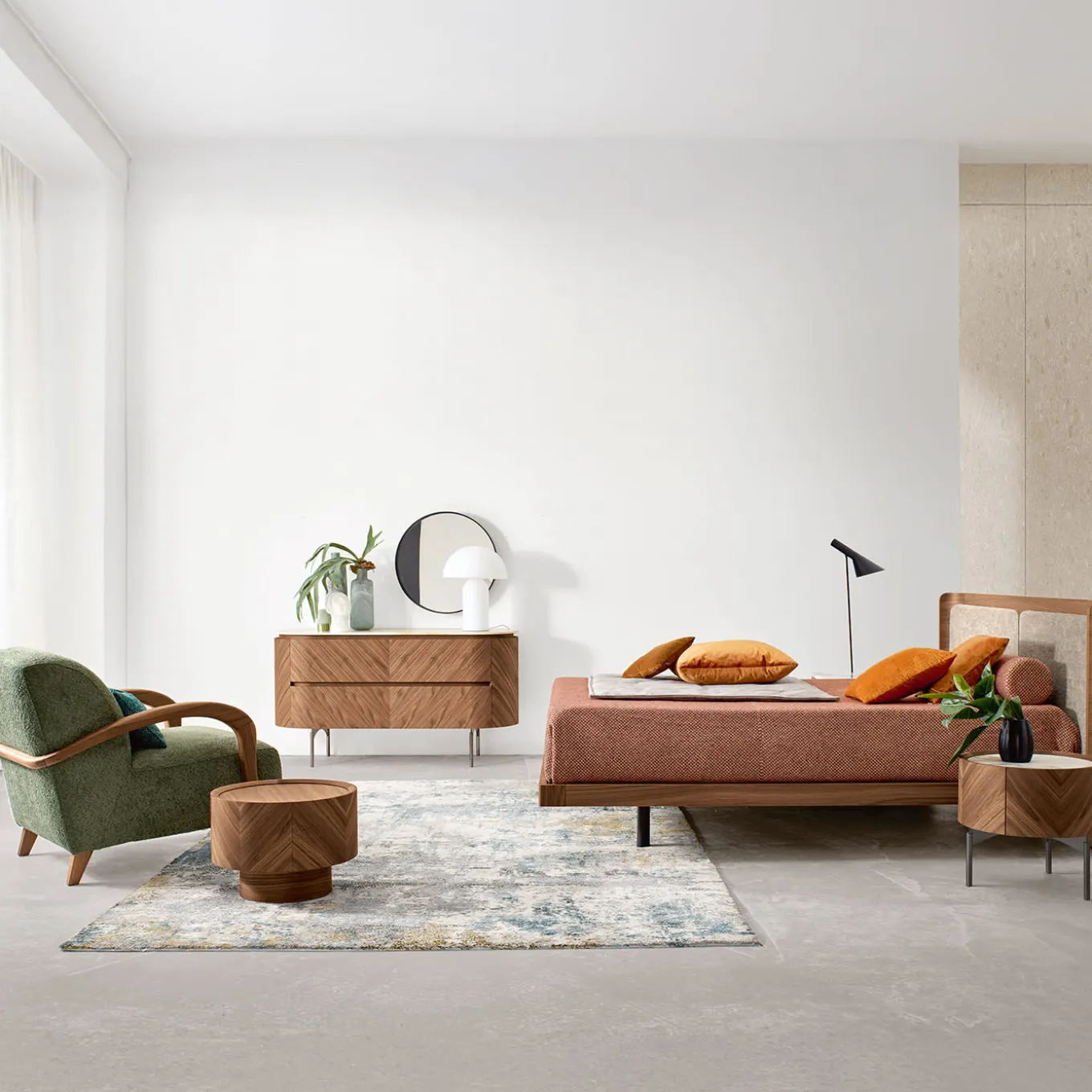 Versatile per diversi ambienti, questo comodino armonizza il caldo noce Avana con un audace piano in ceramica Calacatta. L’impiallacciatura a spina di pesce esalta la struttura arrotondata, fondendo precisione geometrica e texture organica. Sostenuto da sottili gambe in nichel, questo pezzo si distingue come un’aggiunta funzionale e artistica a camere da letto o salotti, perfetto per elevare gli spazi quotidiani con sobria eleganza.