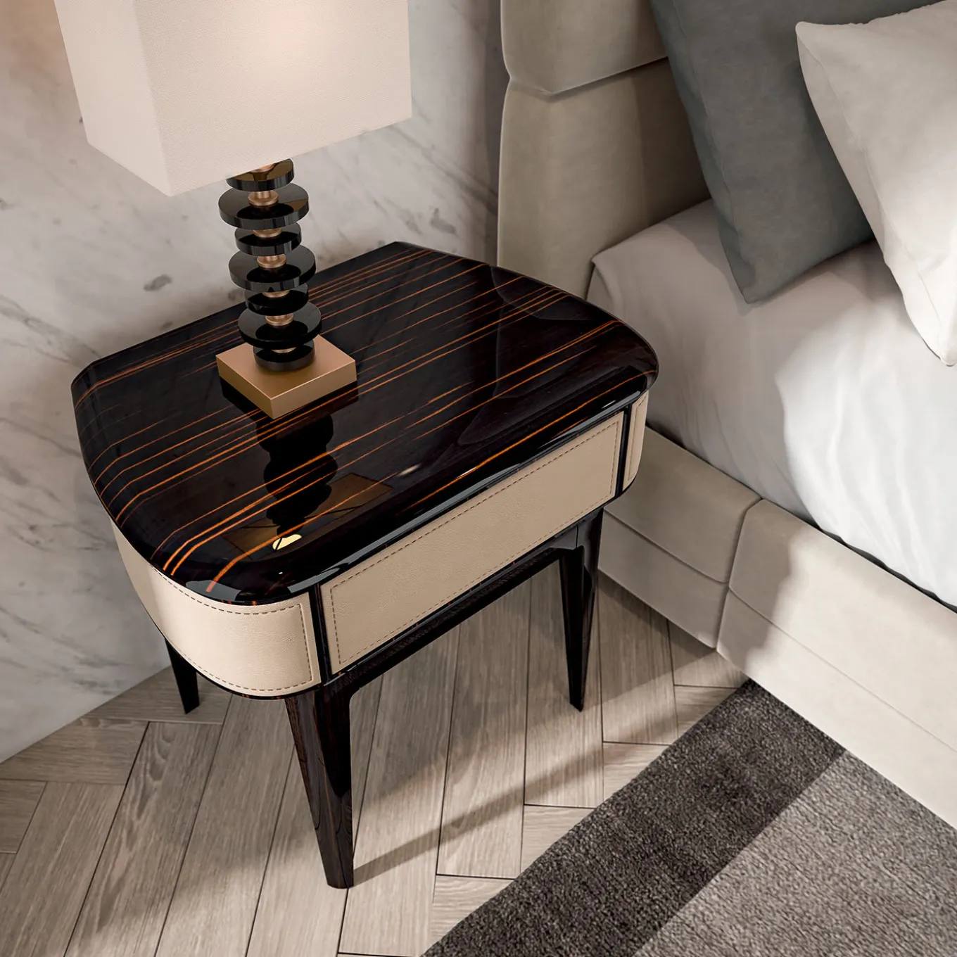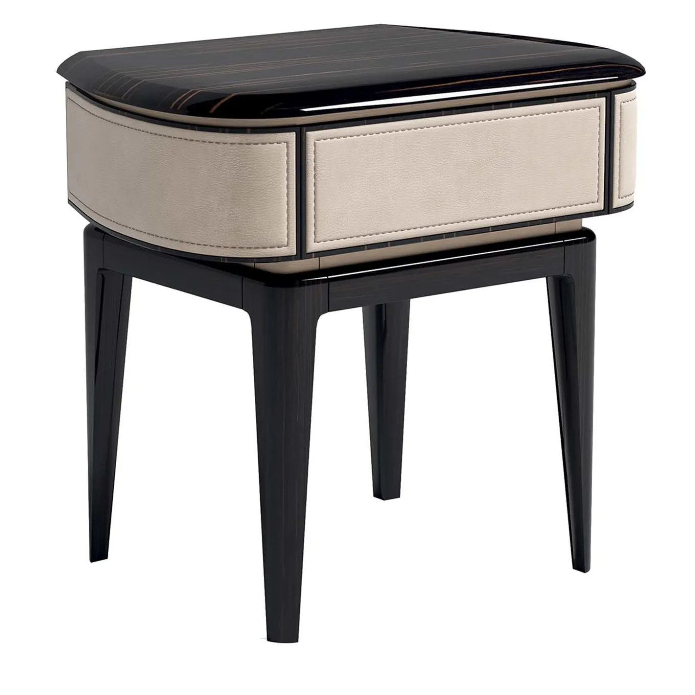 Questo elegante comodino aggiungerà un accento affascinante a una camera da letto moderna, dove potrà essere abbinato agli altri pezzi della stessa collezione retro-chic di Antonelli Atelier. La struttura in legno comprende una base a quattro gambe e un piano impiallacciato in ebano. L’elemento centrale è dotato di un cassetto push-pull rivestito sui lati e sul fronte in pelle beige, mentre l’interno è foderato con un panno in microfibra. Gli inserti in metallo hanno una finitura dorata (disponibile anche in oro rosa o champagne) e il piano può essere anche in marmo o impiallacciato in palissandro o eucalipto grigio.