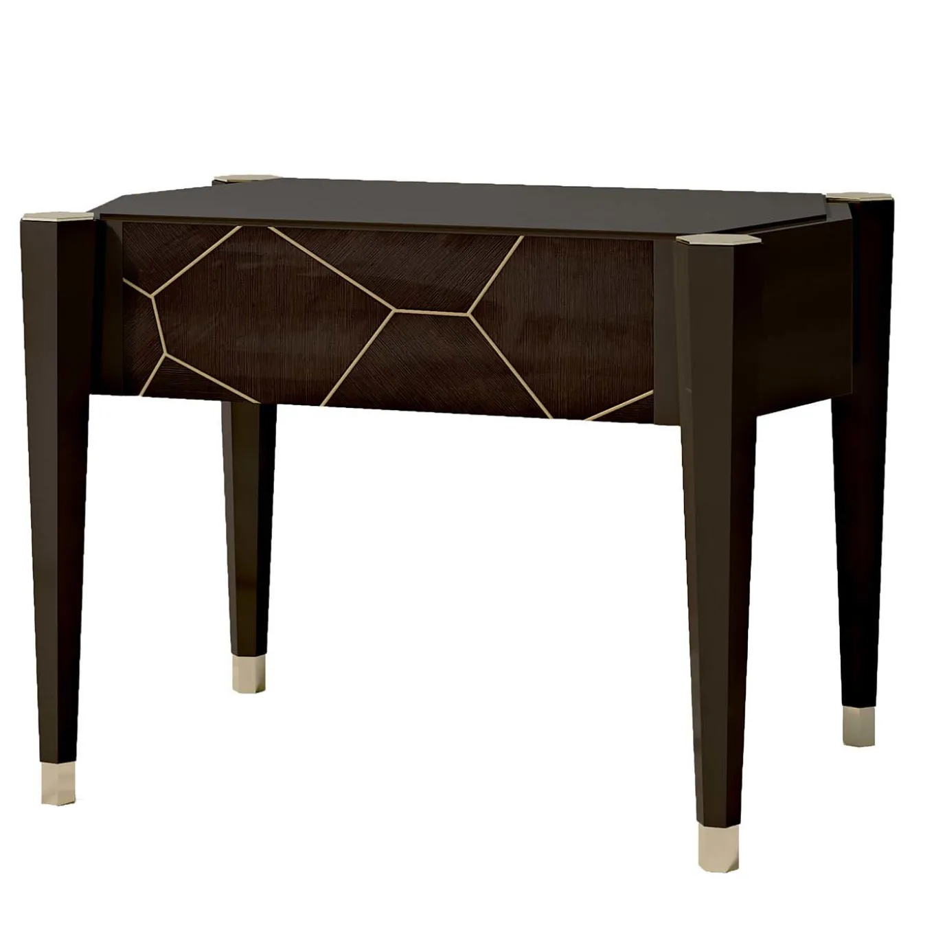 Questo comodino fa parte della collezione Temptation e presenta una forma a diamante. Il pezzo è arricchito dall’uso del legno esotico laccato “Lati” sul cassetto. Le decorazioni irregolari sono incise a mano e con finitura in metallo ottone liquido. Il tutto è completato da dettagli in metallo galvanico dorato sulla parte superiore e inferiore delle gambe. Chiedere al Concierge le opzioni di personalizzazione.