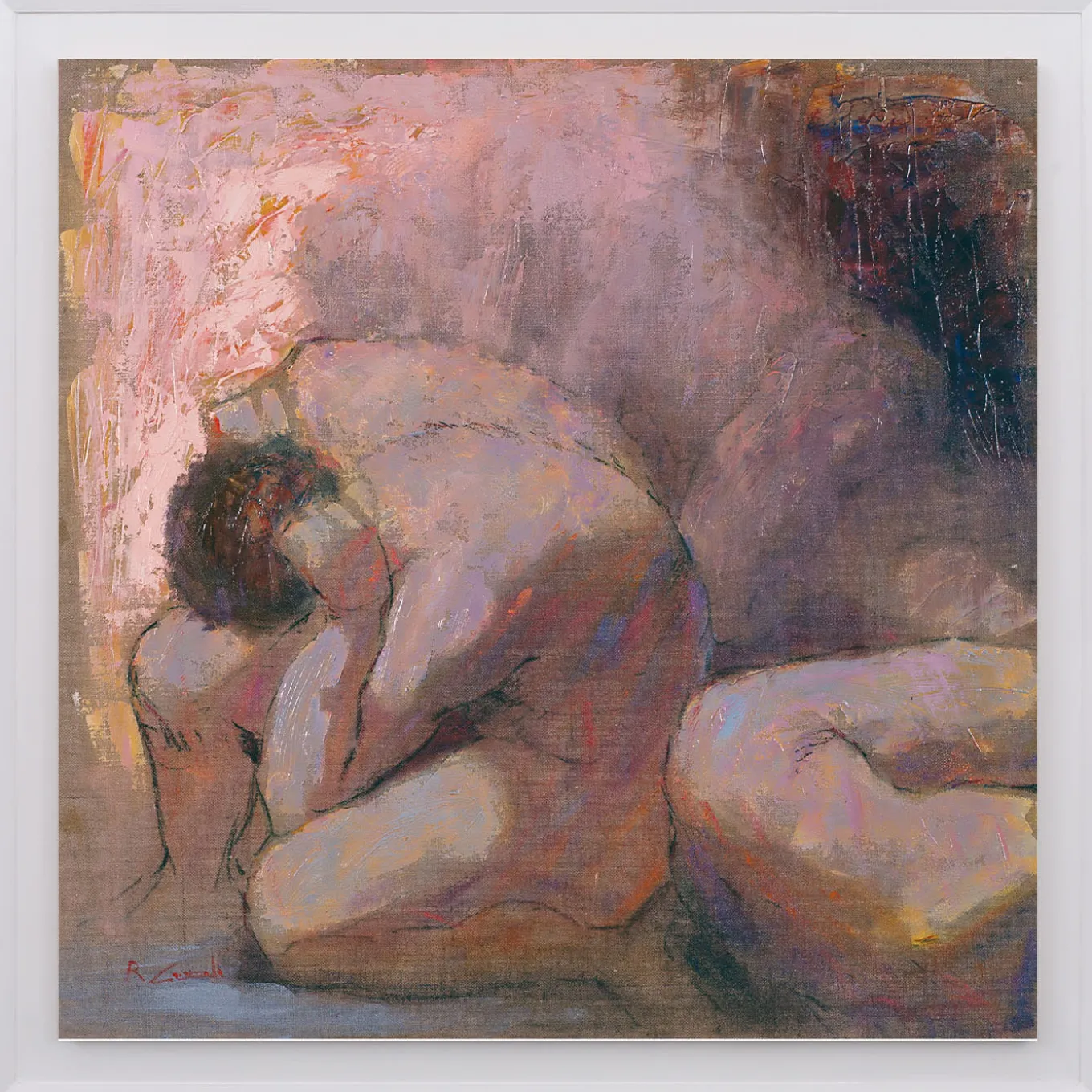 Le pennellate sono decise e il colore quasi tangibile nel suo essere materico, una caratteristica costante delle opere del maestro che ritrae con drammatica intensità la figura maschile in “Composizione”, un olio su tela capace di catturare l’attenzione dello spettatore con i suoi toni intensi ed espressivi. Realizzato su tela di juta, il dipinto ritrae una figura in posizione fetale, affranta e intenta a riflettere sulla propria esistenza e sui propri dolori. La cornice non è inclusa e può essere ordinata su richiesta. Per ulteriori informazioni, rivolgersi al servizio Concierge. L’opera viene consegnata con un certificato di autenticità.