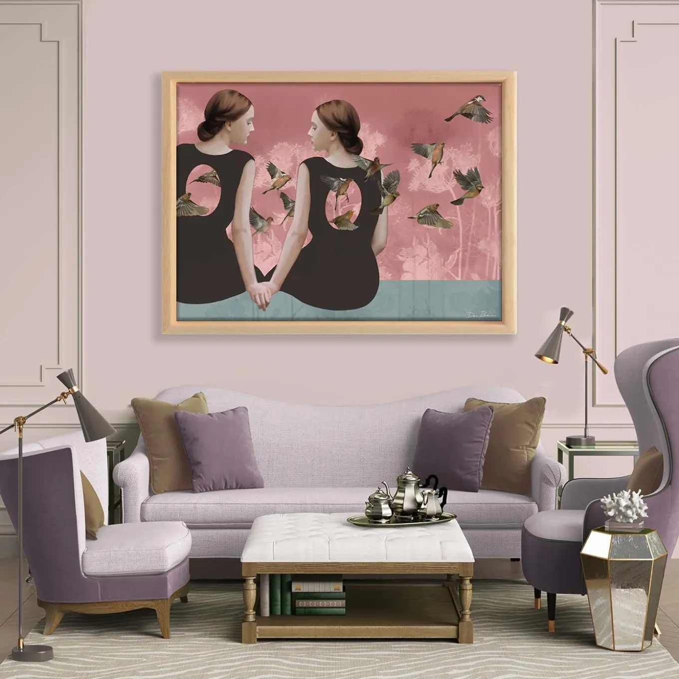 Parte di un’edizione limitata firmata e numerata, questo dipinto digitale pop-surrealista raffigura il legame intimo tra due figure femminili che si tengono per mano. Uno stormo di uccelli passa accanto a loro, rappresentando la loro immaginazione segreta e condivisa. Stampato su tela di cotone di alta qualità montata su legno di abete secco. Cornice in legno di tiglio. Certificato di autenticità incluso.