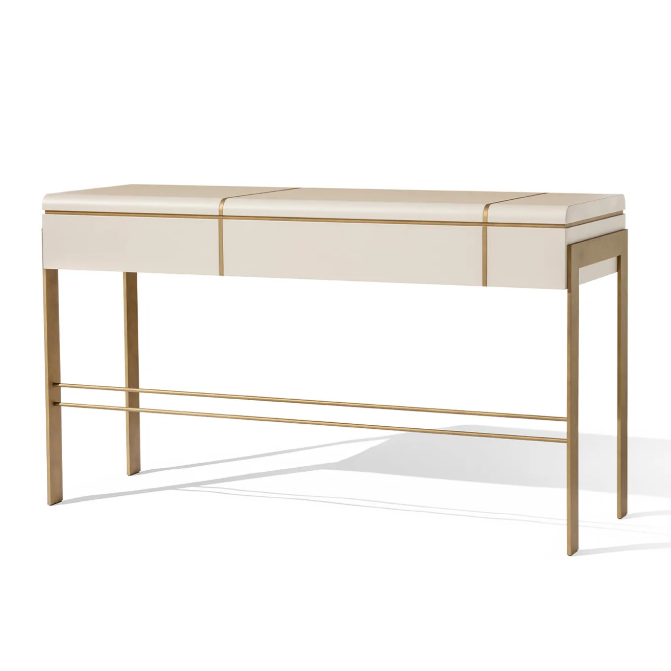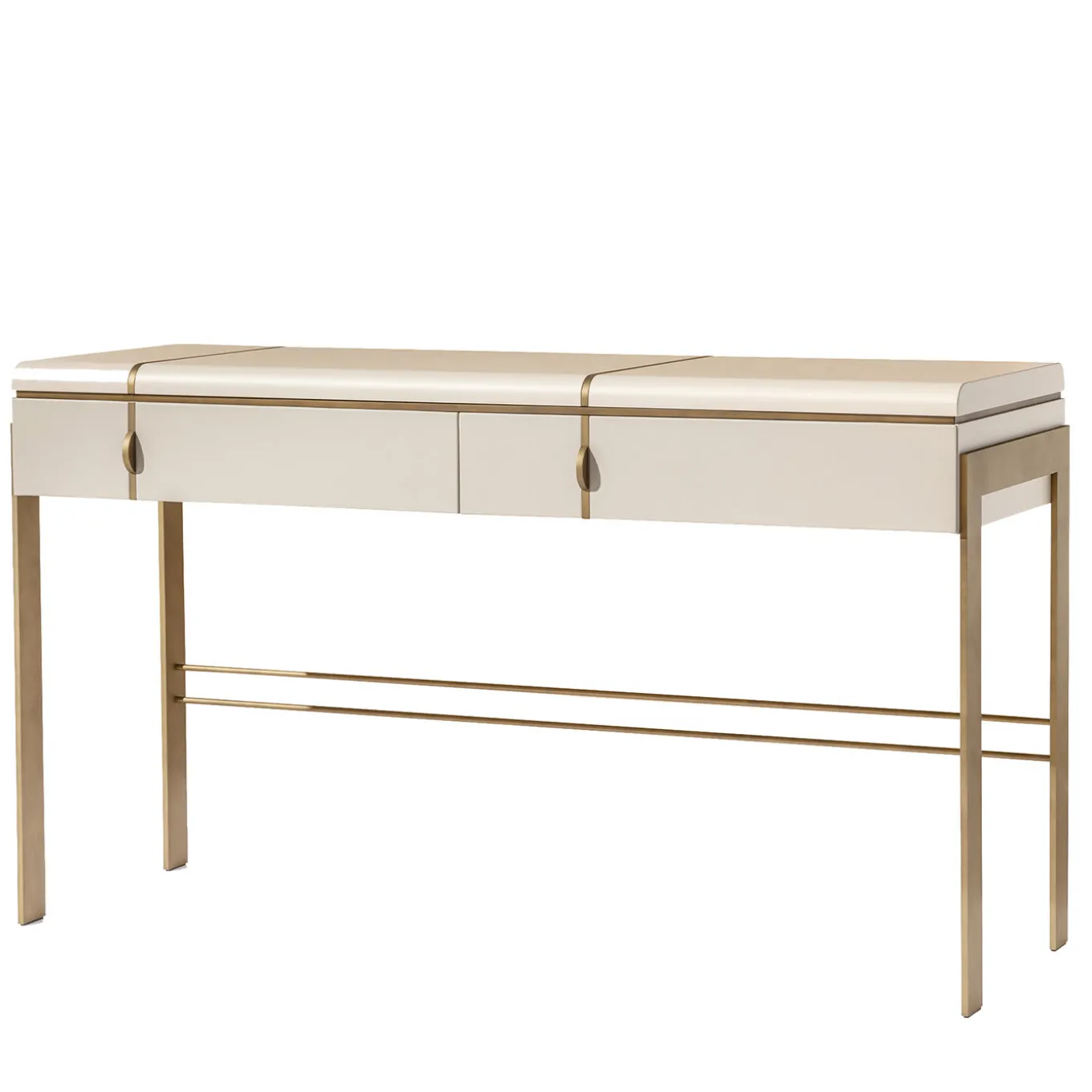 Assolutamente elegante nel suo design pulito ed elegante, questa consolle sarà un pezzo iconico per un ingresso contemporaneo e lussuoso. Combinando un’intramontabile laccatura bianca con dettagli in metallo spazzolato, presenta gambe a barra piatta e un piano dolcemente arrotondato, dotato di due pratici cassetti. Personalizzabile su richiesta, chiedere al Concierge per i dettagli.