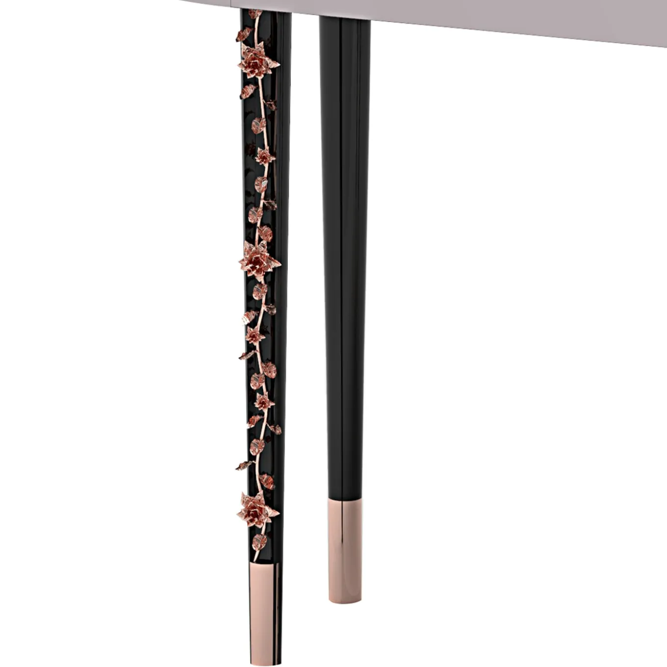 Volumi raffinati e moderni contraddistinguono questa superba consolle. Il piano poggia su quattro gambe affusolate in metallo laccato nero e impreziosito da dettagli in oro rosa. Il piano, di forma allungata, è laccato in bianco e presenta lati arrotondati. Una decorazione 3D di foglie e fiori orna una delle gambe, aggiungendo un tocco inaspettato al pezzo.