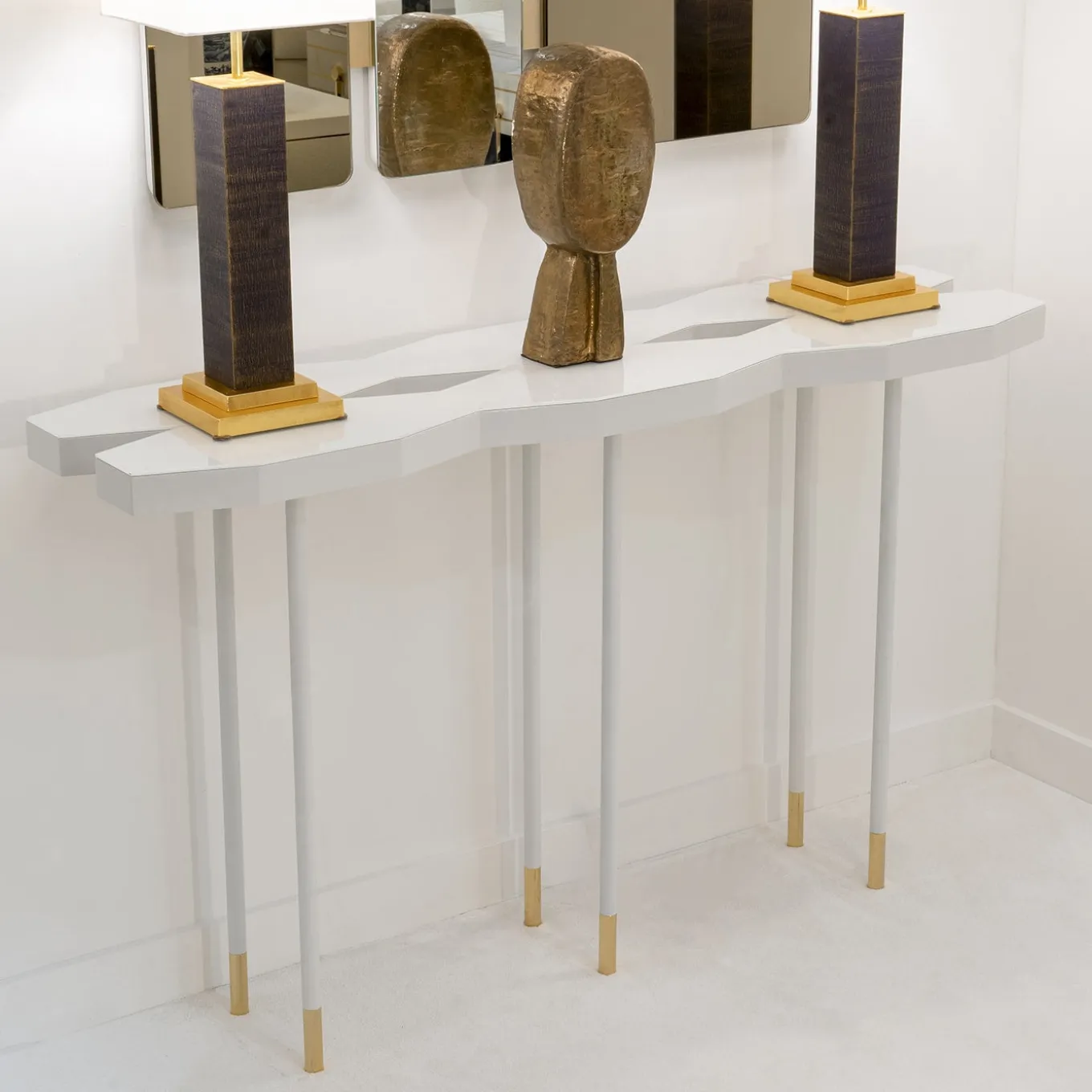 Un pezzo d’accento iconico e sofisticato per l’ingresso di un interno in stile contemporaneo, questa consolle sfoggia un raffinato design scultoreo. Poggiata su sei gambe in ottone laccato bianco opaco arricchite da punte placcate in oro 18 carati, presenta un caratteristico piano poliedrico esagonale con due inserti romboidali aperti, realizzati in vetro retrolaccato.