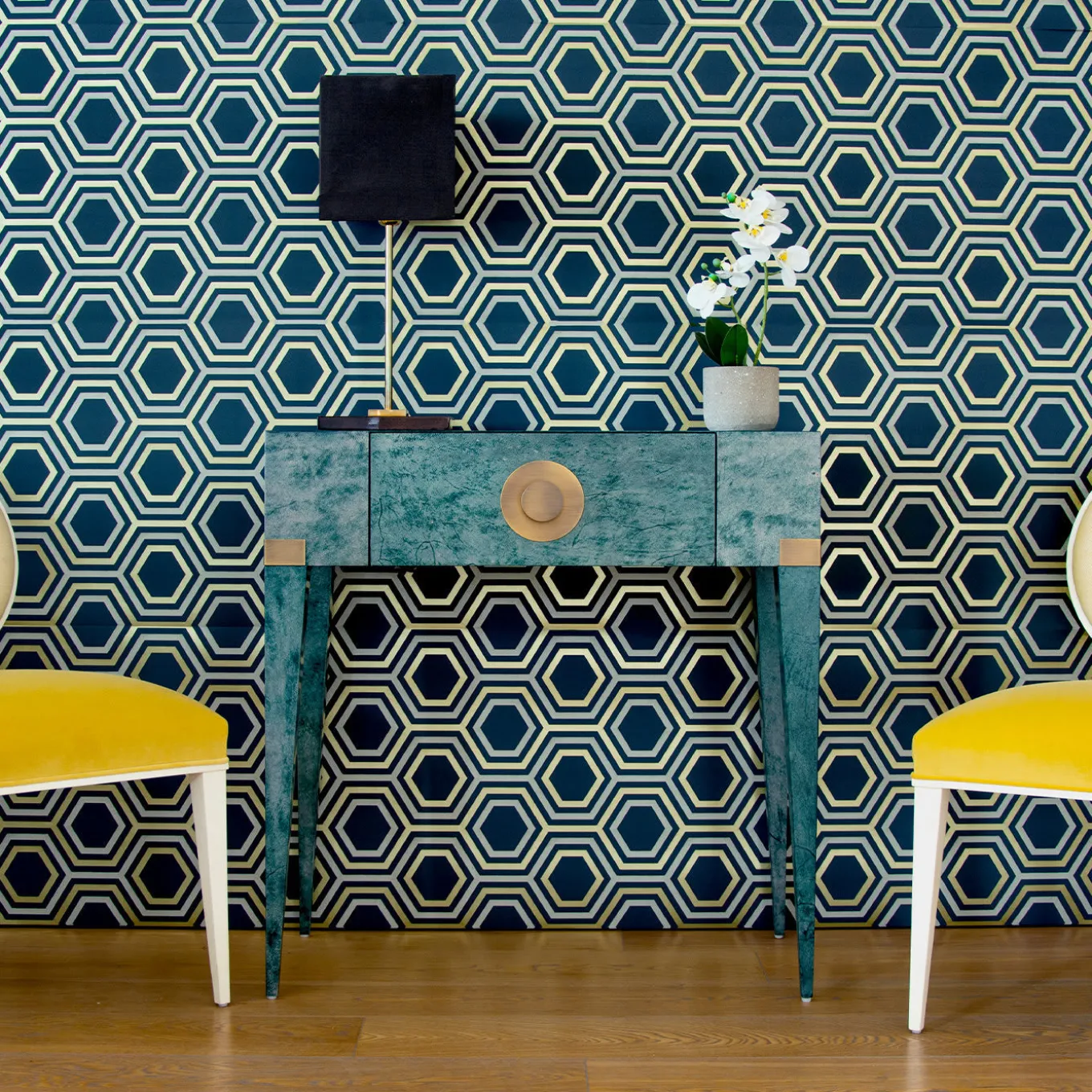 Complemento perfetto della serie di sedute New Moon, questa splendida consolle propone un’ispirazione di metà secolo rivisitata con dettagli moderni ed esclusivi in ottone bronzato satinato. Ideale da collocare in un foyer, l’elegante struttura in legno con gambe sottili e triangolari è interamente rivestita in pelle pergamena blu-verde con un effetto vintage opaco che le conferisce un tocco finale di grande effetto. L’interno dell’unico cassetto frontale è rifinito in legno tinto. Dimensioni e finiture personalizzabili su richiesta, per maggiori dettagli rivolgersi al Concierge.