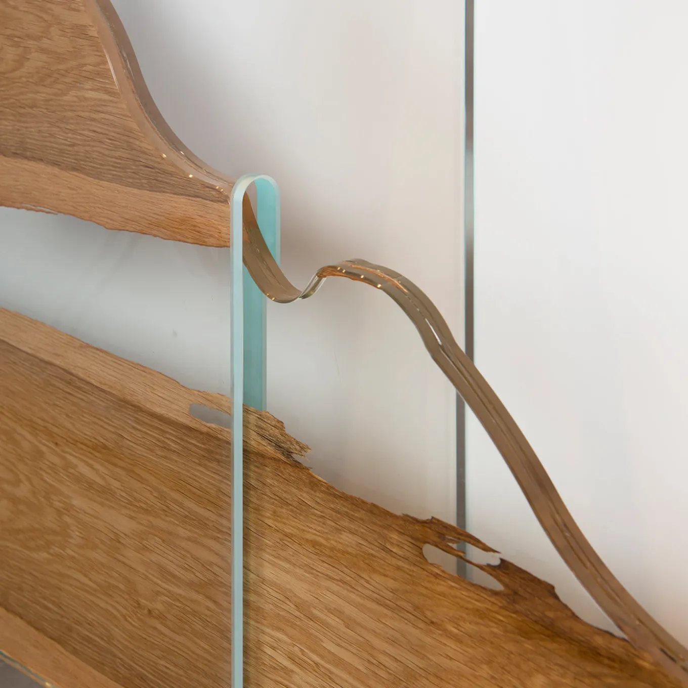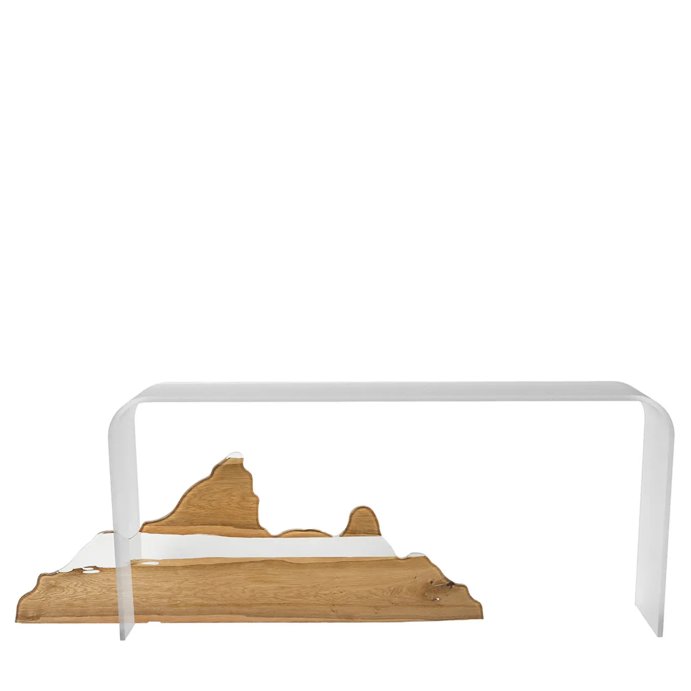 Ispirata al tavolo dell’altare, luogo di culto nelle case cinesi o nei templi buddisti, questa consolle minimalista disegnata da Lea Chen simboleggia l’equilibrio armonioso di forme e materiali. Realizzata in vetro da artigiani veneziani, una gamba della consolle curvilinea semitrasparente è attraversata da una forma di montagna stilizzata con intarsi in legno antico, un simbolo tradizionale dell’Asia orientale di yin e yang spesso presente nei dipinti Shan Shui (Montagna d’acqua).