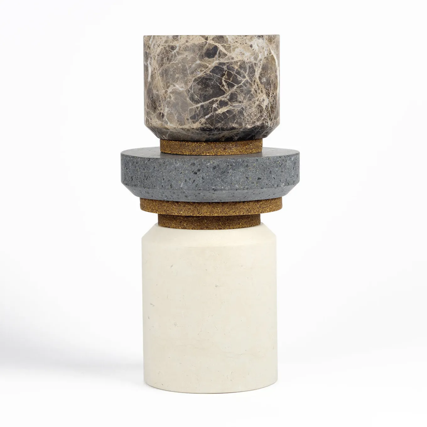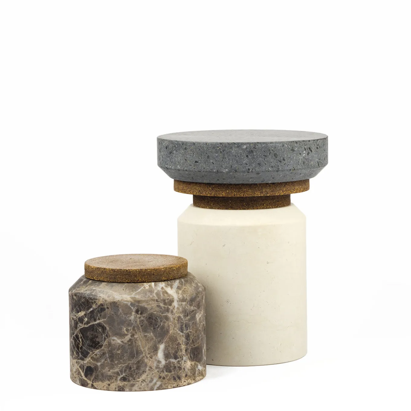 Una collezione composta da tre elementi di contenimento in Pietra di Trani, Pietra Lavica ed Emperador Light con coperchio in Keep Life; un nuovo materiale composito, ecologico e malleabile, ricavato dai gusci di nocciole, castagne, noci, mandorle, pistacchi, arachidi, ecc. Racchiuso nel tempo, il contenitore diventa pietra e il contenuto il suo sigillo.