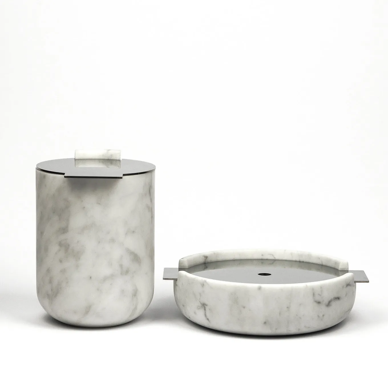Realizzata in marmo bianco di Carrara tornito a macchina, la collezione di contenitori da cucina Kitchen Accessories ricrea le forme iconiche della pentola, della brocca e del cestino da tavola. Con i coperchi e le coperture in acciaio satinato tagliato al laser, che possono essere richiesti anche in materiali diversi, una memoria antica si arricchisce del contributo contemporaneo dell’acciaio, aggiungendo modernità e funzionalità.
