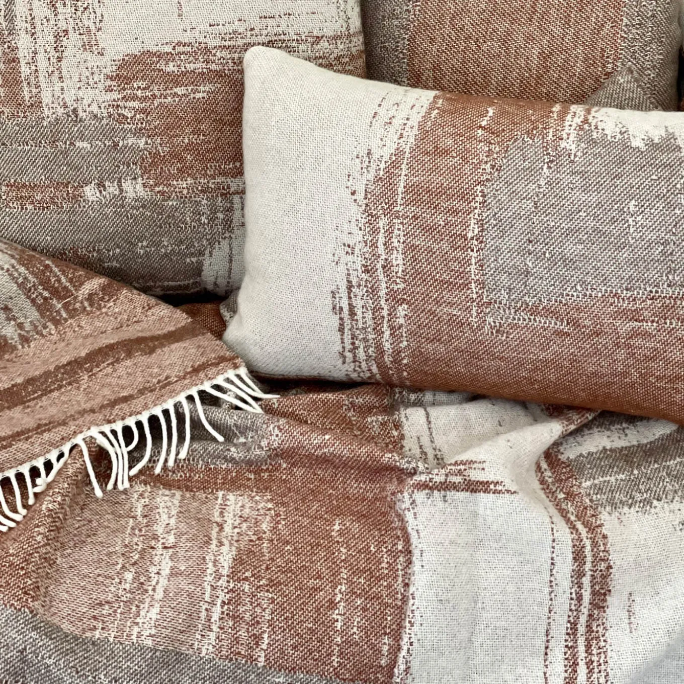 Questa elegante coperta artigianale, tessuta a mano da artigiani comaschi con una miscela di 80% lana Merino e 20% cashmere, presenta un accattivante motivo irregolare che sembra ricreare delle pennellate. La scelta intelligente di toni terrosi per la trama ne favorisce l’inserimento in un’ampia varietà di palette e stili. Completato da una frangia. Si consiglia il lavaggio a secco.