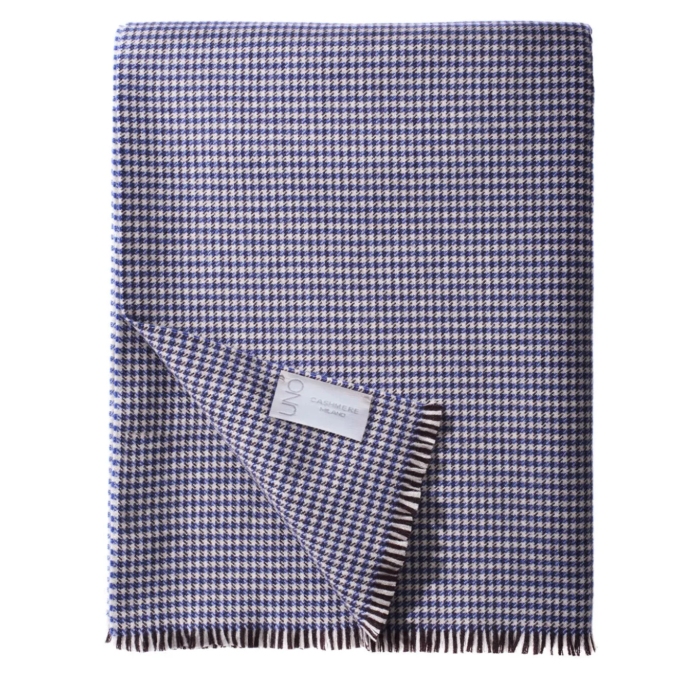 Sorprendentemente caldo e familiare, questo superbo e grande copriletto – tessuto al telaio con fili di cashmere di prima qualità – si distingue per la sua sobria eleganza e il suo superbo potenziale di comfort. Frutto di un accurato processo di tessitura, il suo disegno pied-de-poule di colore blu non ne intacca la morbidezza, ma crea un coinvolgente impatto visivo, ulteriormente ravvivato dal disegno a frange presente su due dei suoi lati.