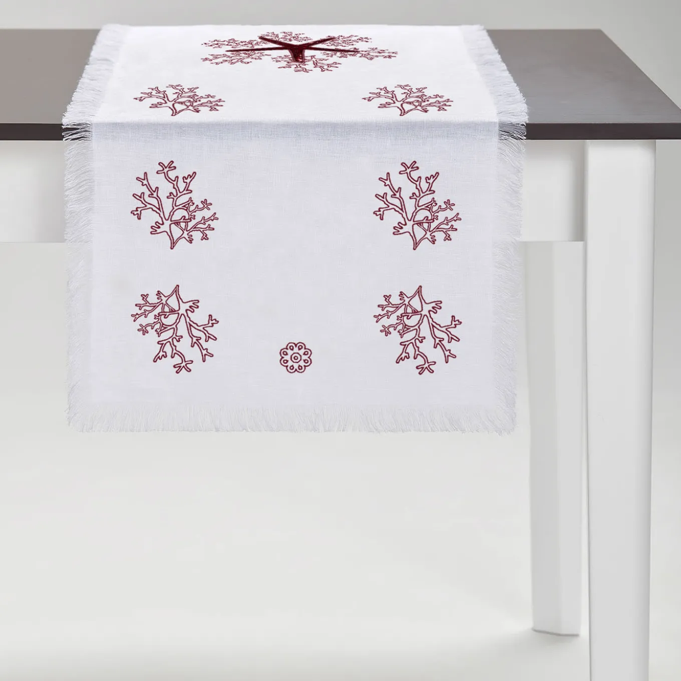 Arricchito da delicate applicazioni di spangles, minuti ricami di stelle marine e coralli contraddistinguono questo prezioso runner in lino bianco certificato Masters of Linen. Cucito con il pregiato cotone Mako, ogni centimetro del ricamo è il risultato di un diligente lavoro manuale svolto da abili artigiani. Profili a frange animano i lati del runner, disponibile in più varianti di colore.