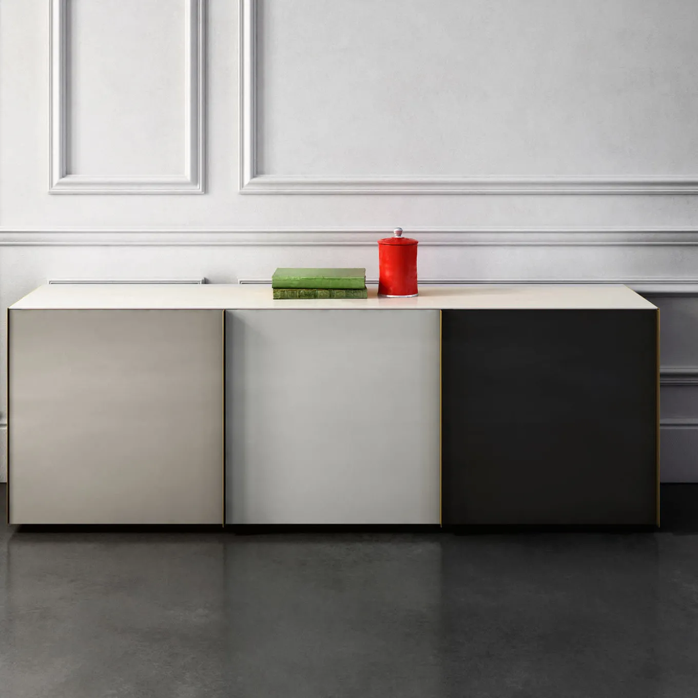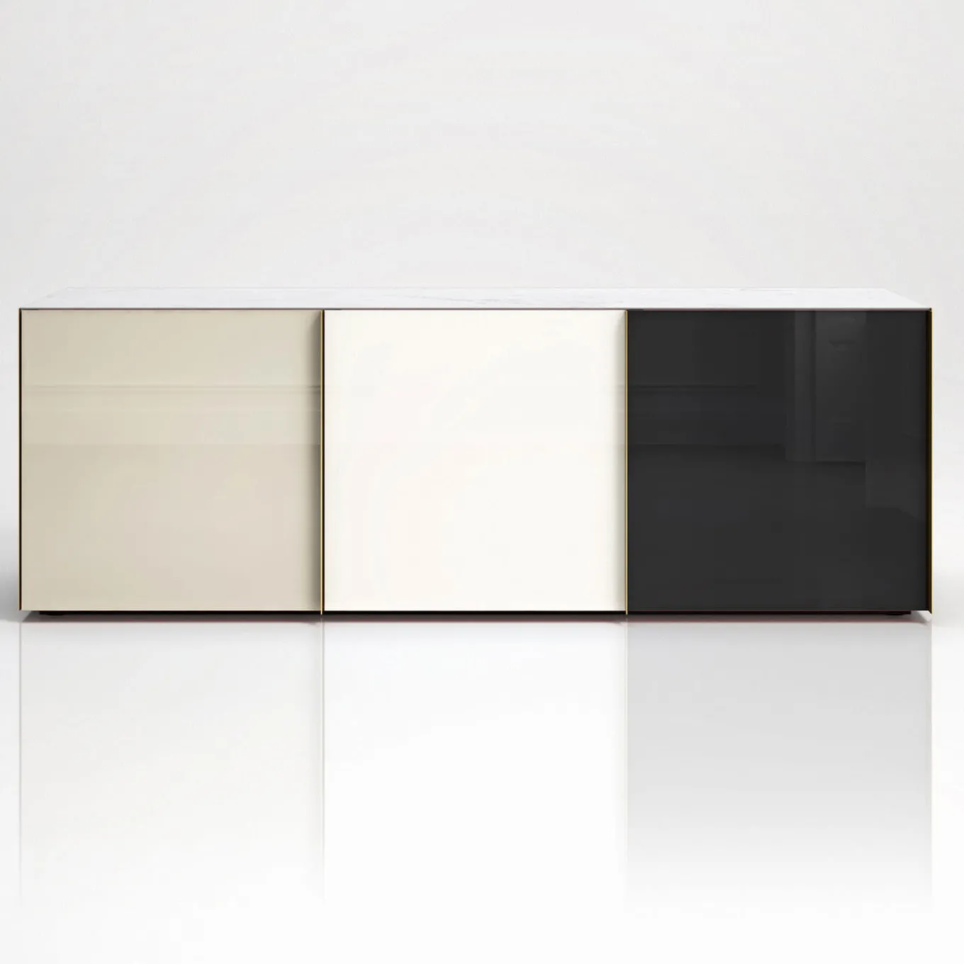 Questa credenza moderna vanta una solida struttura in legno laccato, abbinata a ripiani e ante in vetro. Tutte le ante sono retroverniciate in toni neutri, per elevare immediatamente l’atmosfera di ogni ambiente producendo riflessi ipnotici insieme alle snelle maniglie e ai pannelli laterali, tutti in ottone luminoso. Il piano è in pregiato marmo di Carrara, ma il progetto è disponibile anche in altre varianti di materiale e colore; per maggiori dettagli, rivolgersi al Concierge.