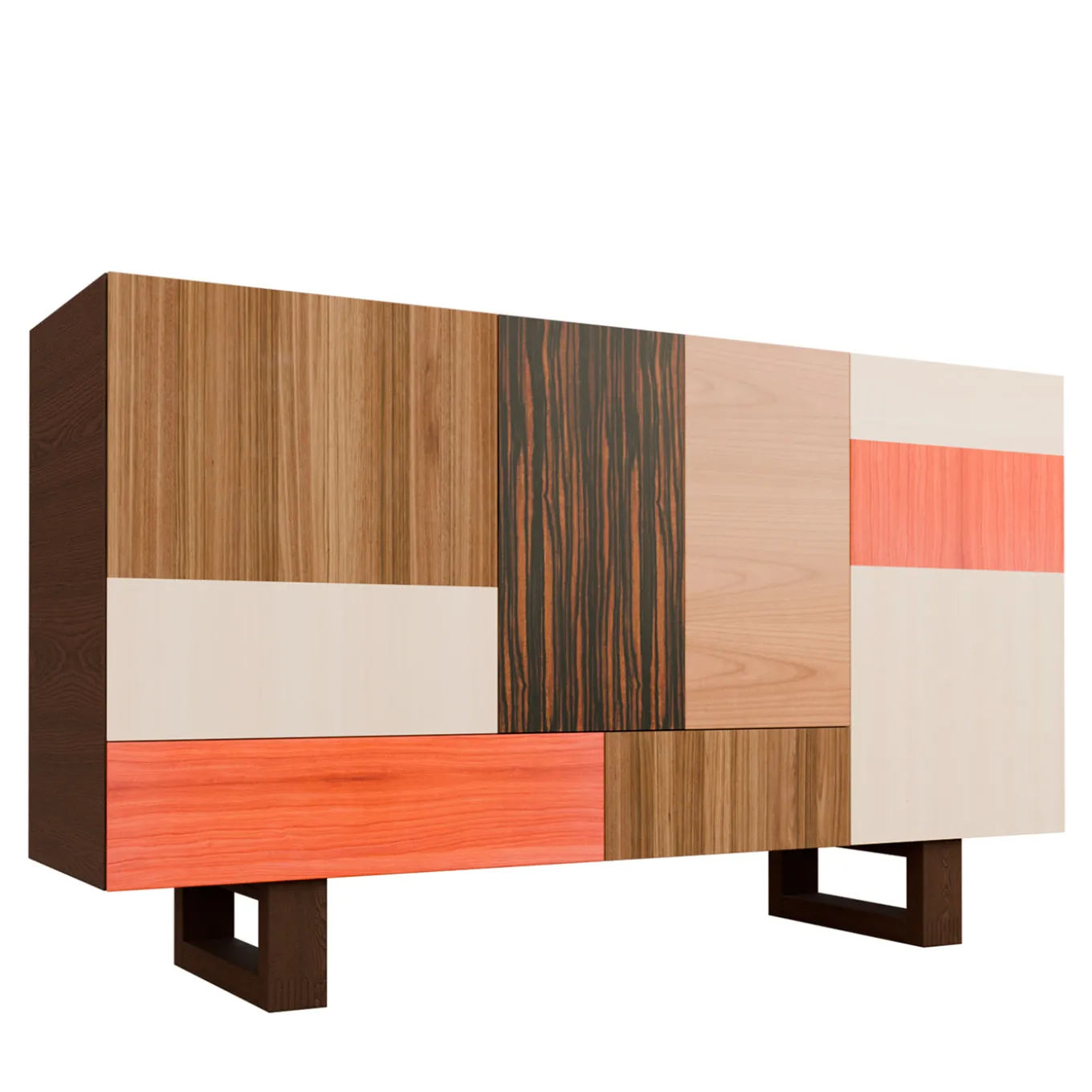 La credenza Fantesca presenta un design moderno con un patchwork di impiallacciature pregiate, tra cui ebano makassar, noce, acero, ciliegio e padouk. Offre un pratico spazio contenitivo grazie a quattro ante e due cassetti, arricchiti da ripiani interni. La struttura e i piedini sono realizzati in massello di frassino, combinando eleganza e funzionalità in un arredo adatto a diversi stili di interni. Questa credenza incarna l’artigianalità del mobile contemporaneo con un raffinato mix di texture e tonalità del legno.