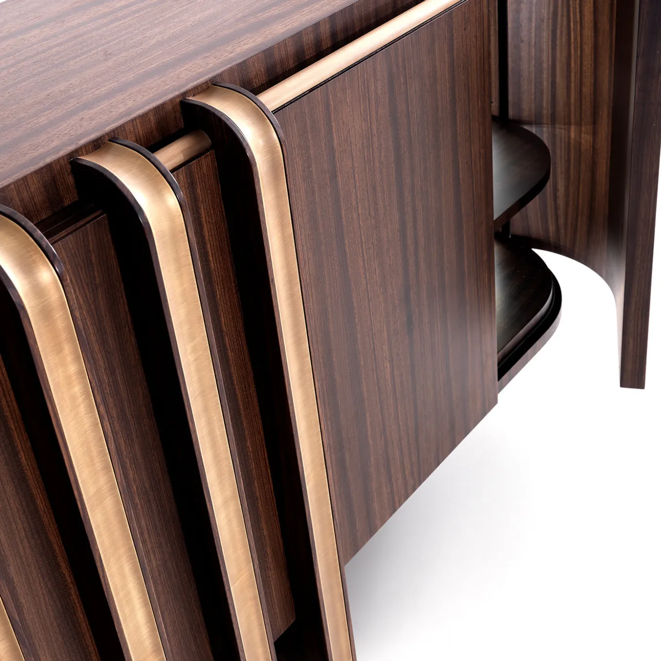 Un’estetica raffinata e audace contraddistingue questa accattivante credenza realizzata in pregiato legno di zebra. La sua imponente struttura si distingue per gli angoli smussati e le superfici lisce estremamente piacevoli al tatto. I dettagli in ottone massiccio si susseguono in linee verticali parallele che abbelliscono le ante anteriori e accentuano i bordi della struttura per aggiungere una sottile luminosità al design, che poggia su una base leggermente affusolata.