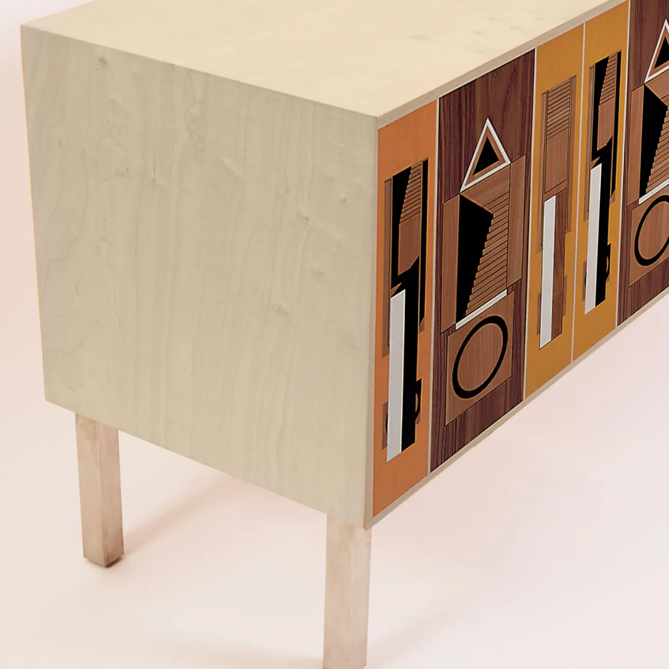 Motivi retrò e morbide tonalità granulose abbondano in questa credenza in legno disegnata da Aldo Rossi e realizzata a mano dagli abili falegnami di Laura Meroni, utilizzando impiallacciature di pioppo e acero. Le ante si aprono per rivelare ripiani regolabili e una base regolabile in acciaio inox spazzolato. Edizione limitata.