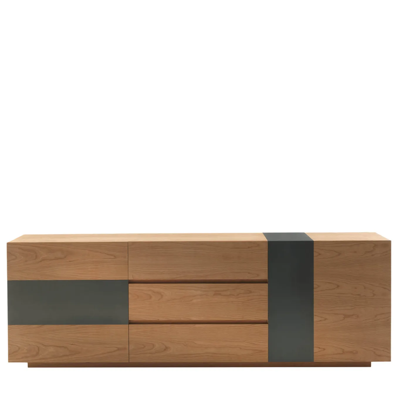 Un’ode all’eleganza senza sforzo dei profili minimalisti, questa credenza è un pezzo progettato per completare con eleganza gli arredi moderni. Una base a zoccolo sostiene il resto della struttura in rovere, rifinita a cera per esaltarne al meglio le volute naturali. Dotati di maniglie a gola, i tre cassetti frontali sono affiancati da lastre di ferro laccate grigio polvere per accenti di profondità cromatica.