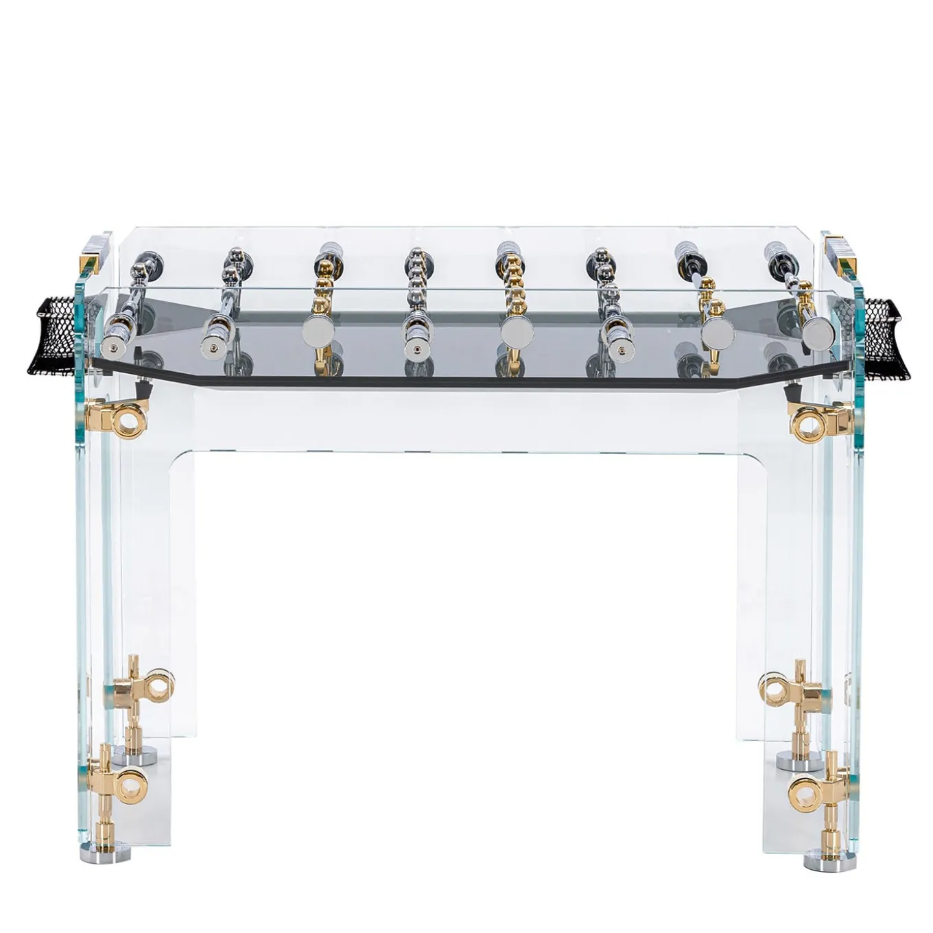 Un originale, dal design alla creazione e alle rifiniture. Cristallino è realizzato con tecnologie all’avanguardia e con le mani esperte di artigiani italiani che perfezionano ogni dettaglio per un’opera d’arte unica ed esclusiva. Struttura in cristallo trasparente temperato, spessore 9/16″, con angoli smussati e lucidati all’ossido di cerio. Campo da gioco in cristallo laminato. Una squadra placcata in oro 24 carati, l’altra in alluminio cromato lucido Lastra modellata che si inclina agli angoli. Disponibile in vetro fumé.
