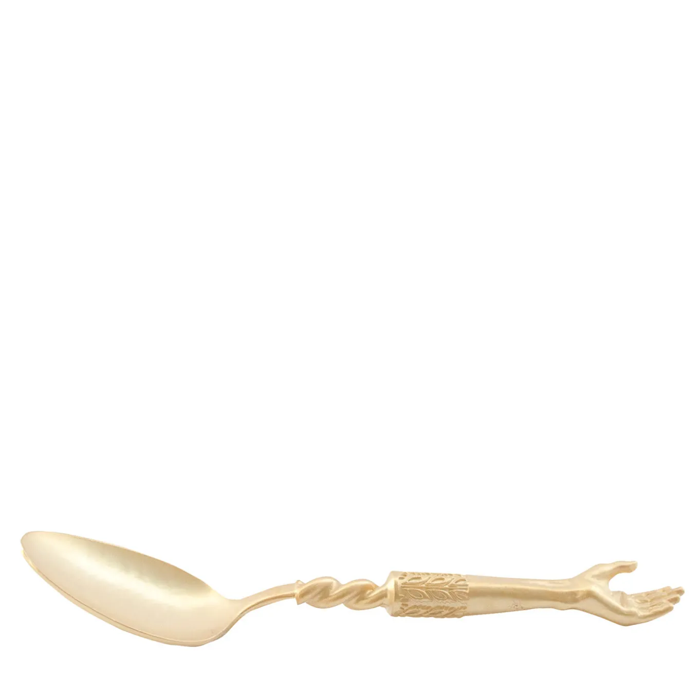 Parte della collezione Joyas en Casa – “gemme in casa” in inglese – questo luminoso cucchiaio è realizzato a mano in ottone con una preziosa placcatura in oro. Il suo tratto distintivo è il manico antropomorfo, caratterizzato da un gambo attorcigliato che si trasforma in un braccio dai dettagli raffinati. Sempre giocoso ed elegante, questo cucchiaio conferisce un accento sofisticato a qualsiasi collezione di argenteria.