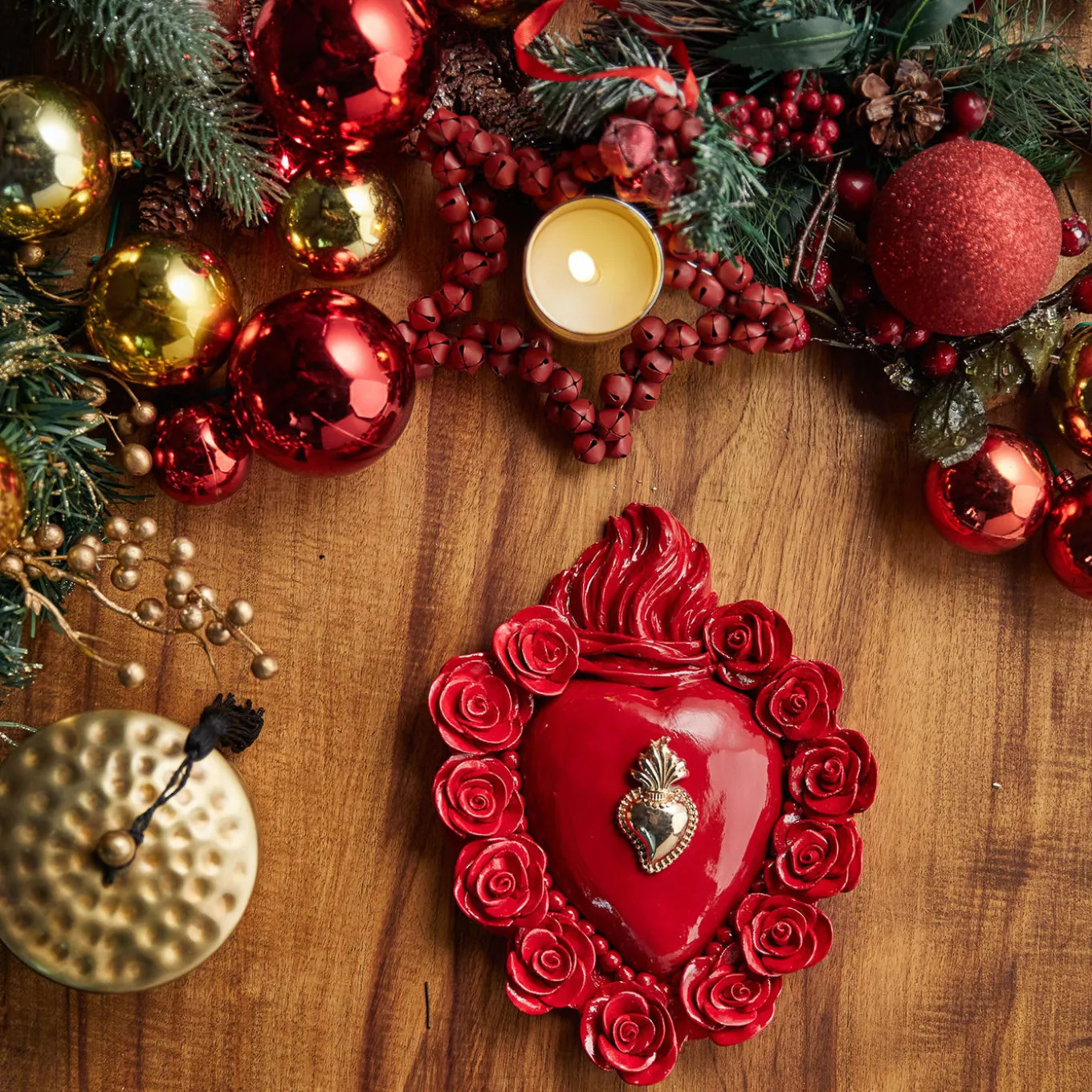 Elegante omaggio agli ex voto italiani e ai cuori sacri messicani, questa affascinante ceramica rifinita con smalto rosso presenta un cuore in metallo lucido, un filo di perle rosso fuoco e uno splendido motivo di rose rosse lungo i bordi. Sofisticata opera di maestria artigianale, questo pezzo straordinariamente romantico si presta a essere esposto con altri elementi della stessa collezione.