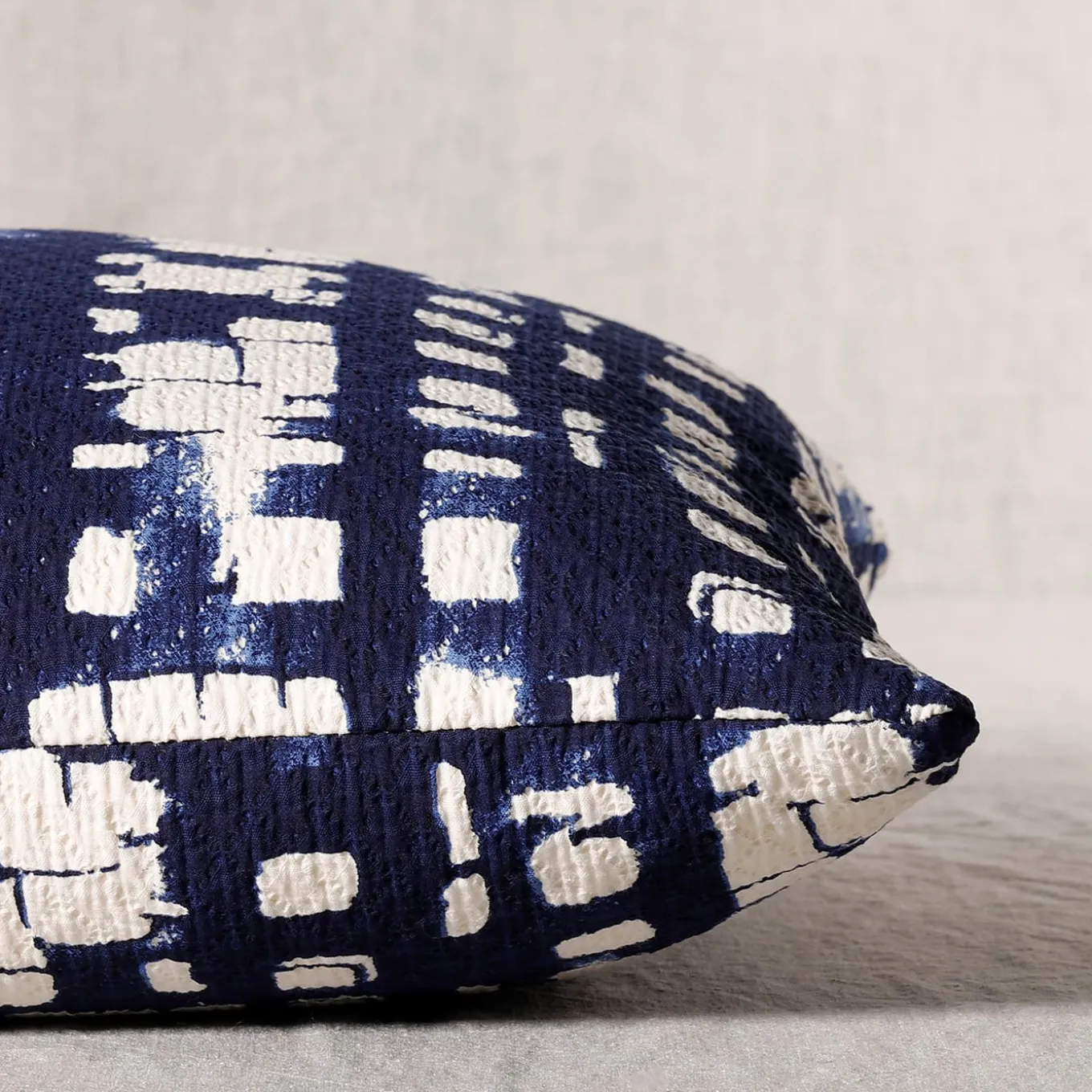 Il blu indaco del cuscino in cotone jacquard è inciso dal bianco fluido, creando un effetto increspato che riecheggia il mare Egeo, seducente nelle sue profondità e nei suoi misteri.