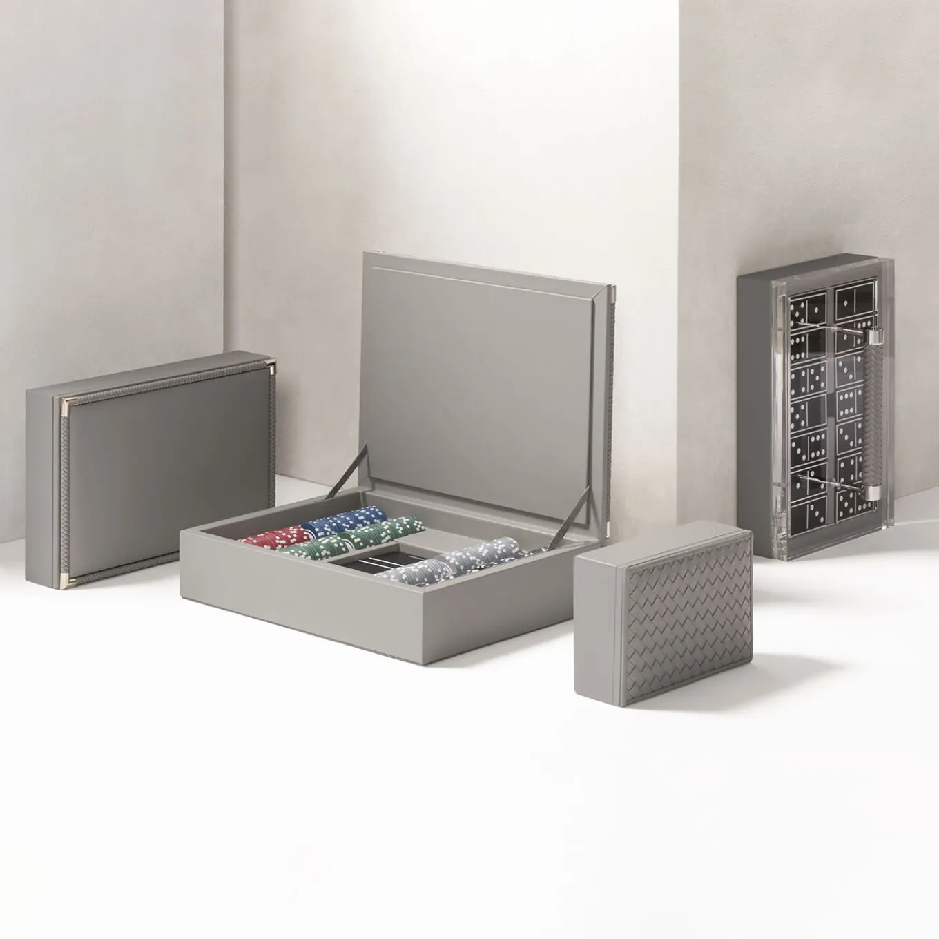 Scatola in pelle con finiture in pelle intrecciata e dettagli in metallo cromato o dorato. Sono inclusi un mazzo di carte da gioco di alta qualità e fiches da poker in ceramica con 5 tagli.