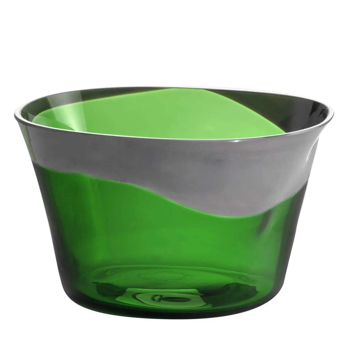 Una silhouette volutamente irregolare, apparentemente segnata da lievi ammaccature, caratterizza la Collezione Dandy a cui appartiene questa preziosa coppetta in vetro di Murano. Abilmente soffiata a bocca e rifinita a mano, permette di gustare il gelato ammirando la vivacità del suo tono verde contrastato solo da una fascia grigia ondulata nella parte superiore. Sono disponibili diverse opzioni di colore.