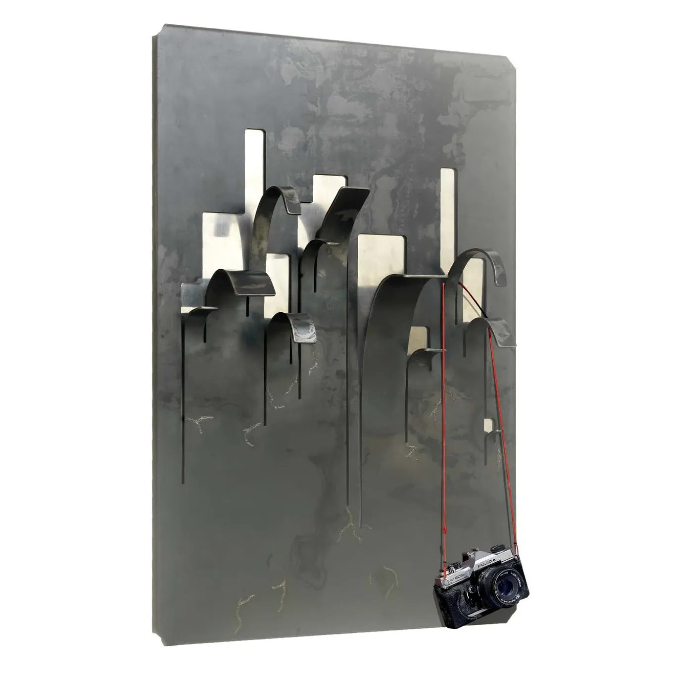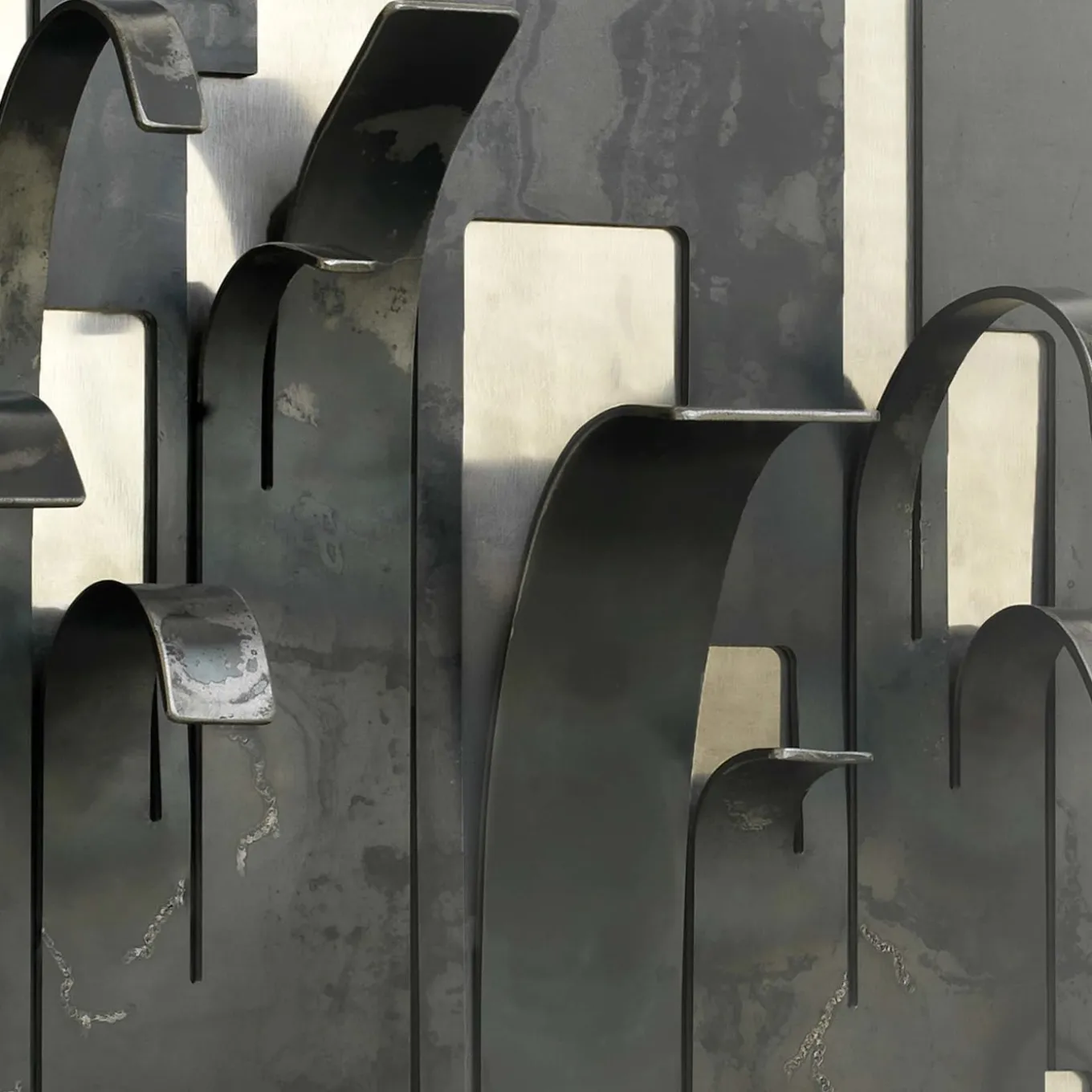 Quando la pelle esterna si apre, appare l’anima interna, metafora di una ferita che non può essere rimarginata. Il ferro è un materiale vivo, si protegge dagli agenti atmosferici ossidandosi e assumendo toni scuri e disomogenei (policromia). Un appendiabiti di colore marrone e argento realizzato in ferro e acciaio.