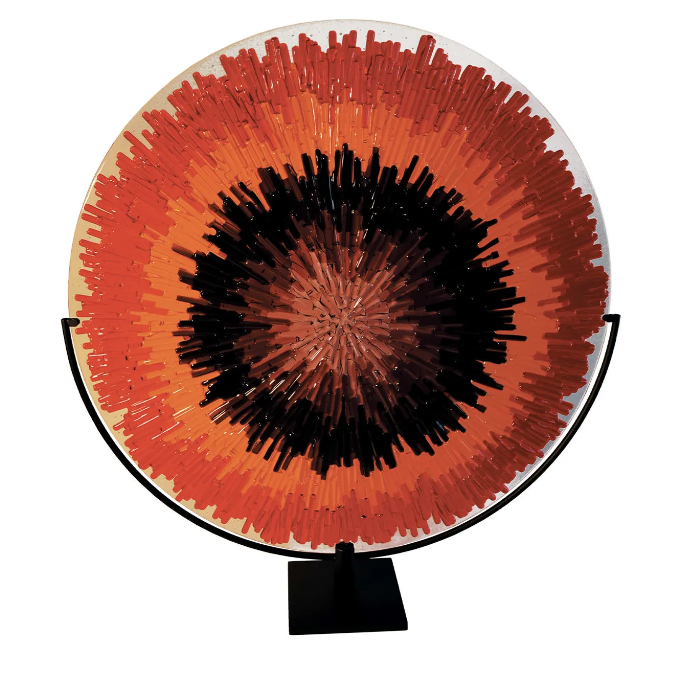 Progettato come una scultura unica, è stato trasformato in un disco straordinario. I raggi del sole o i riflessi della luce rendono il vetro del disco estremamente brillante. La scultura è realizzata con la tecnica della fusione di bacchette di vetro di Murano opaco e trasparente: rosso, ametista, arancione e viola. Le bacchette di vetro sono meticolosamente tagliate e unite a mano. Il supporto metallico è finemente dipinto in nero antracite.