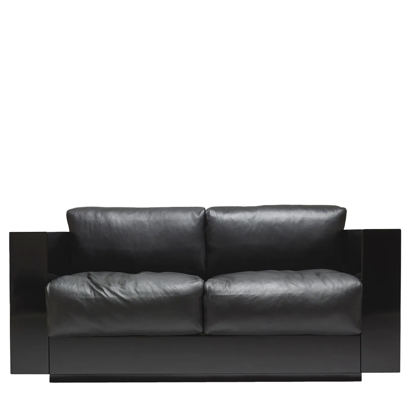 Stupendo divano a due posti o poltrona d’amore per aggiungere un accento unico e sofisticato in un interno contemporaneo, questo progetto di Lella e Massimo Vignelli si distingue per un look total black assolutamente raffinato. Caratterizzato da linee pulite ed essenziali, presenta una struttura in legno rifinita con una laccatura lucida in poliestere e completata da due sedute e due cuscini di schienale morbidamente imbottiti di piume e rivestiti in pelle di alta qualità.