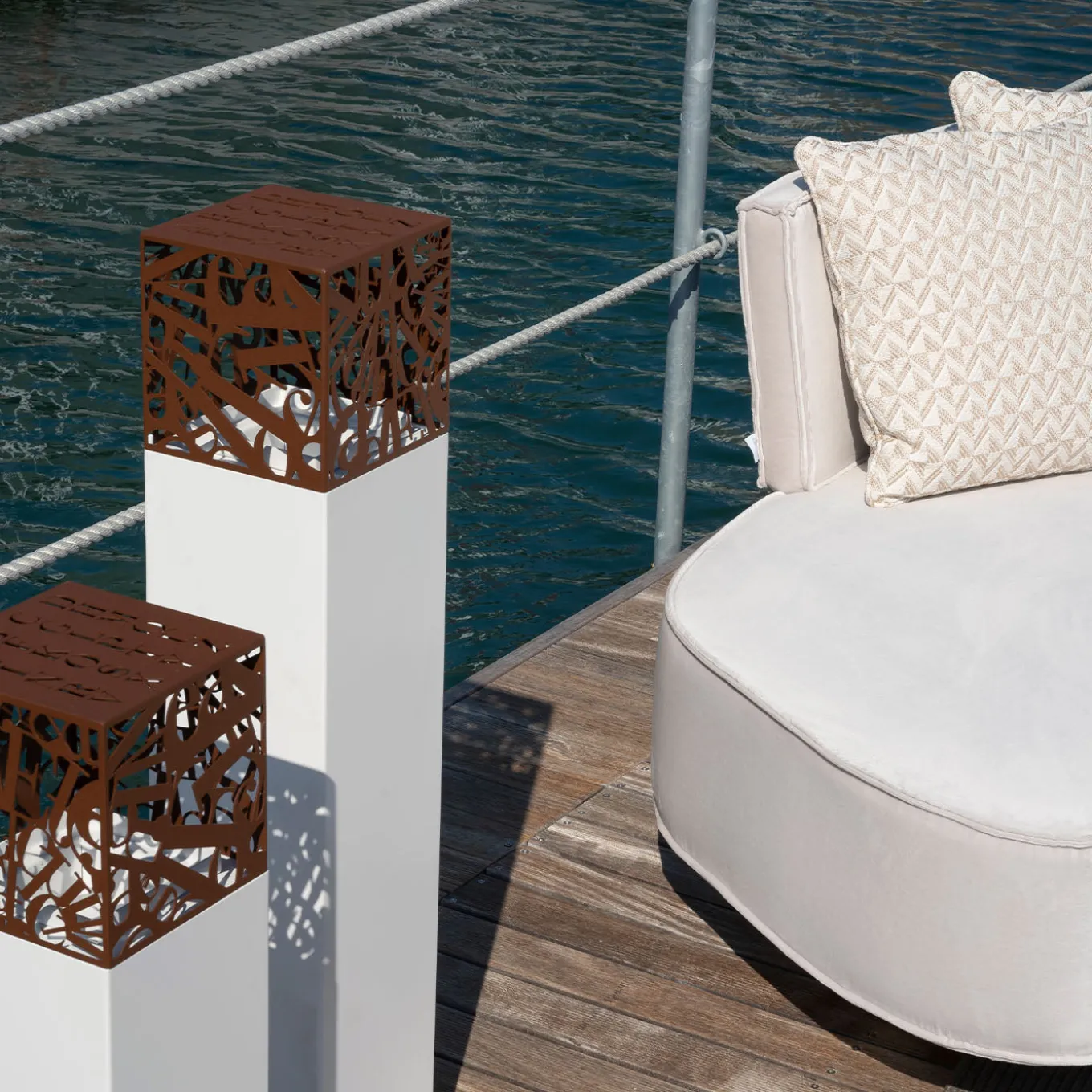 Il divano Cayman presenta una silhouette curva con un telaio di legno multistrato e cinturini elastici. L’imbottitura in poliuretano è rivestita con un tessuto bianco protettivo e idrorepellente per una maggiore durabilità all’aperto. Lo schienale e i cuscini decorativi riempiti con fibra sintetica sono avvolti in un tessuto resistente all’acqua e sono completamente rimovibili per una facile pulizia. Include due cuscini da 50×50 cm con cordoncino. Opzioni di personalizzazione disponibili in più colori e tessuti trattati per esterni. È disponibile anche una copertura protettiva in tela nautica separata. Si prega di contattare il Concierge per ulteriori informazioni.