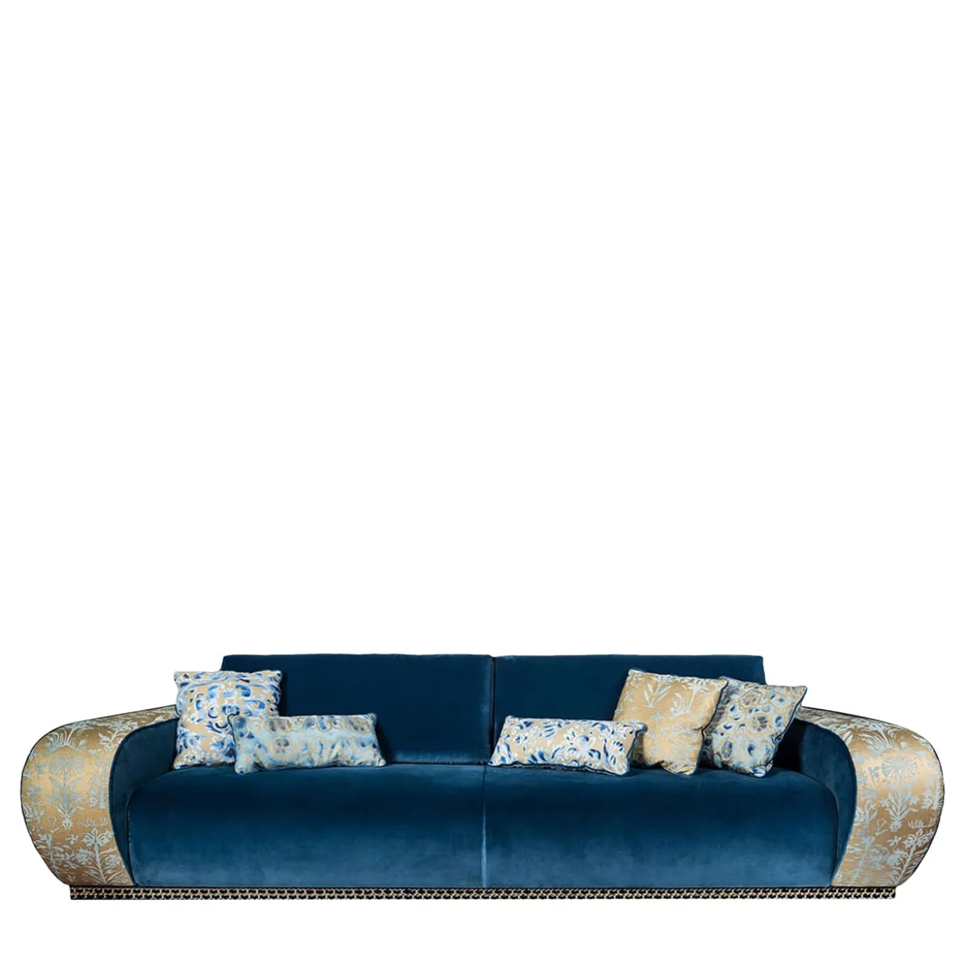 Realizzato originariamente da esperti artigiani veneti e reinterpretato da Slow+Fashion+Design, questo splendido divano sarà il protagonista di un ambiente lussuoso. Ispirato agli antichi tessuti Fortuny e alla secolare arte giapponese Shibori, è realizzato a mano in legno e acciaio, imbottito con schiuma d’acqua e kapok e rivestito con velluto blu e dettagli in jeans dorati. La base è arricchita da una catena di metallo. I cuscini possono essere inclusi su richiesta.