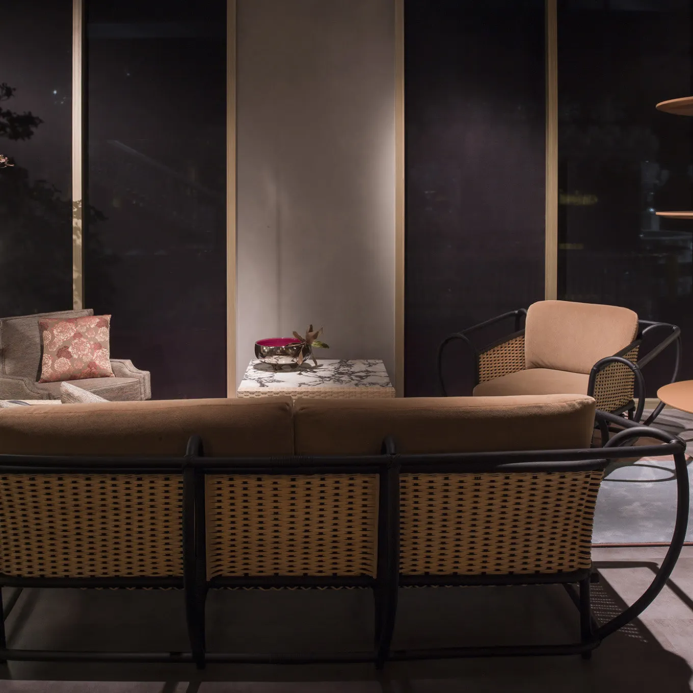 Questo divano vanta una silhouette unica e innovativa che eleva l’aspetto di un arredamento moderno. Squisitamente realizzato in canna nera e arricchito da un intreccio di ispirazione classica sulla seduta e sullo schienale, la struttura è accattivante e maestosa nel suo gioco di curve. I due grandi cuscini della seduta e dello schienale sono rivestiti in tessuto rosso; per maggiori dettagli sui materiali, rivolgersi al Concierge.
