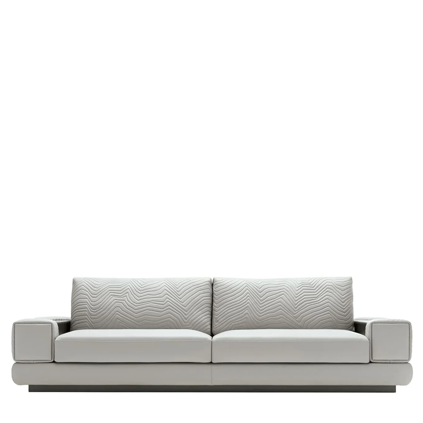 Divano a 3 posti disponibile in pelle di prima scelta, pelle nabuk, pelle stampata lucertola, velluto o tessuto scamosciato. Sedute e fianchi del divano con cuciture speciali in poliuretano espanso avvolto in piuma d’oca. Schienale e braccioli trapuntati. Fascia metallica nei braccioli con logo Giorgio Collection laserato. Base e fasce in acciaio inox satinato grigio nichel. Chiedere al concierge i dettagli della personalizzazione.